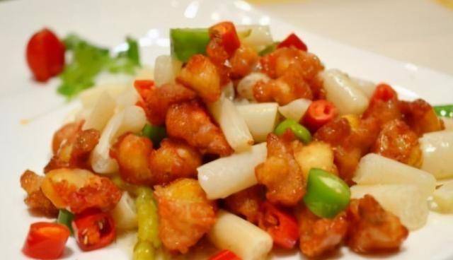 步骤4.炸好的食材先小火炒一会,然后加入上一步的淀粉水翻炒。很快会挂糊的,不要炒过了。收干了水分就可以出锅了。如果感觉淡了可以在加点盐。