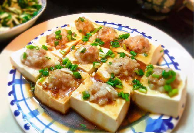 3、油豆腐开口,填入肉馅,隔水,大火蒸15分钟;