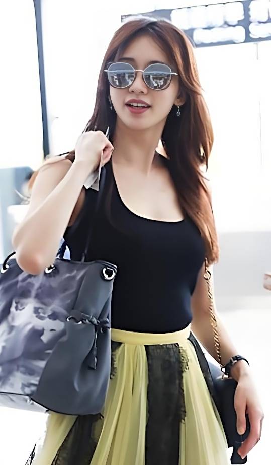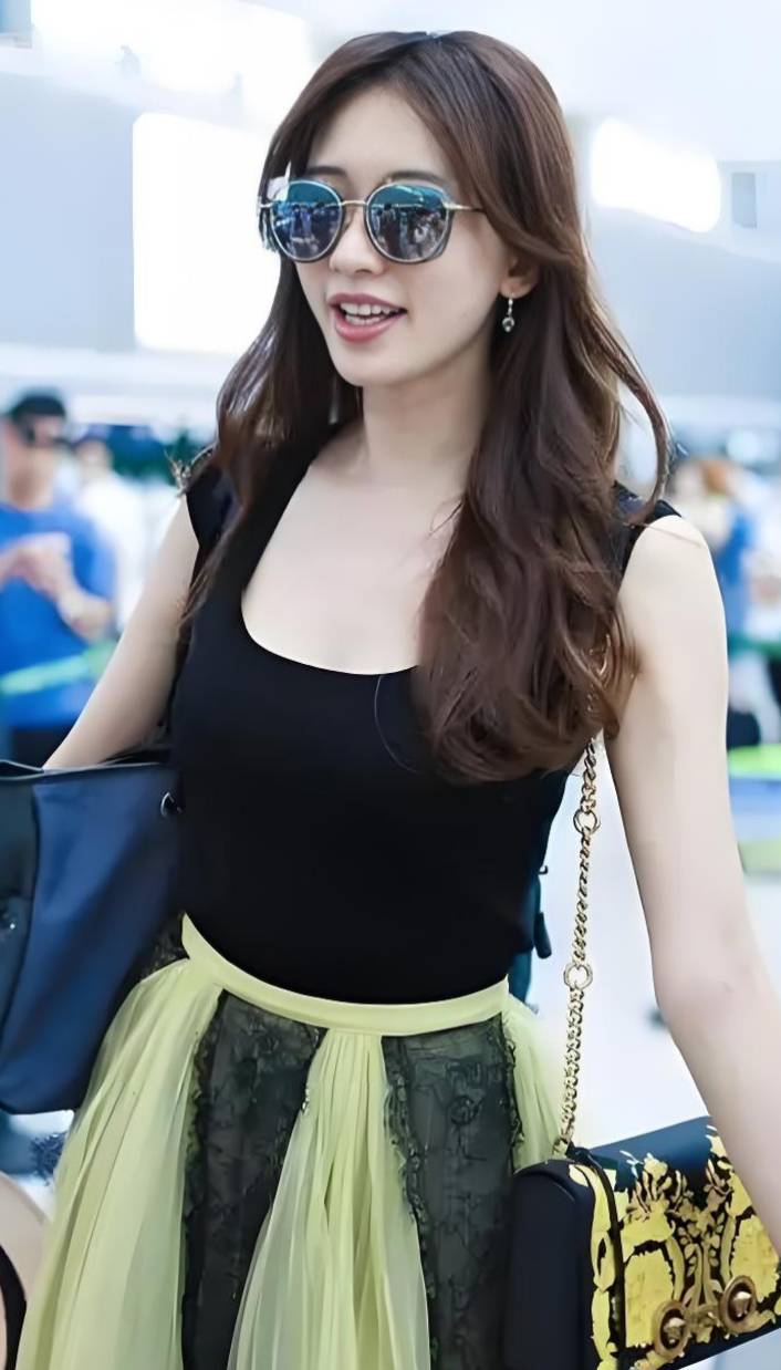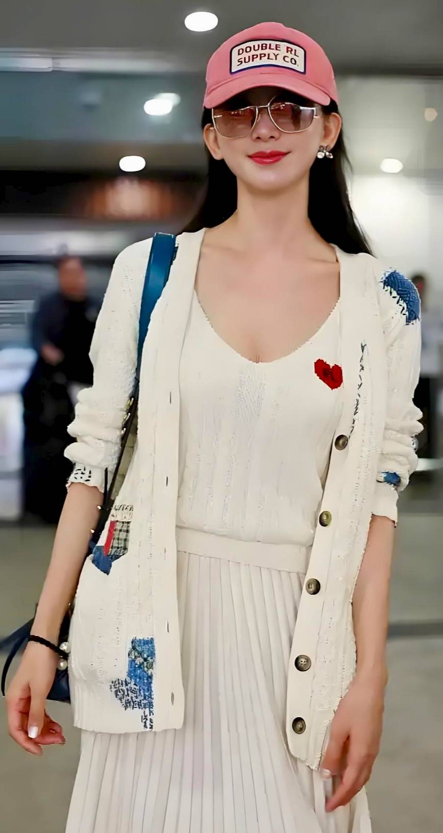 她多次选择深V领连衣裙或抹胸长裙现身机场,如黑色深V裙凸显锁骨与肩颈线条,碎花抹胸裙搭配牛仔外套则兼具清新与妩媚,通过适度露肤展现成熟韵味。