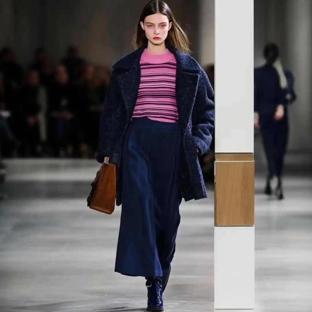 这件藏蓝色的大衣,搭配蓝色百褶裙,她把对生活的热爱,融入了藏蓝色大衣下的裙摆里,有精致的细节美。