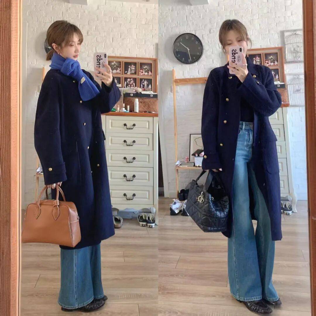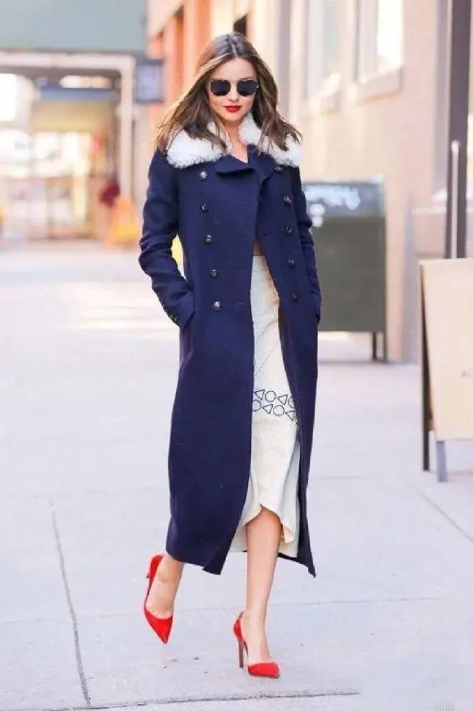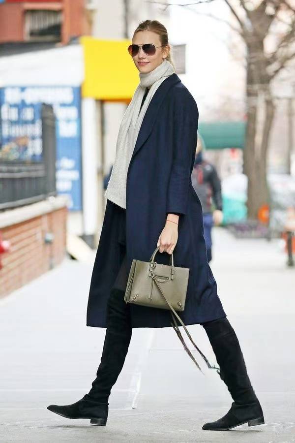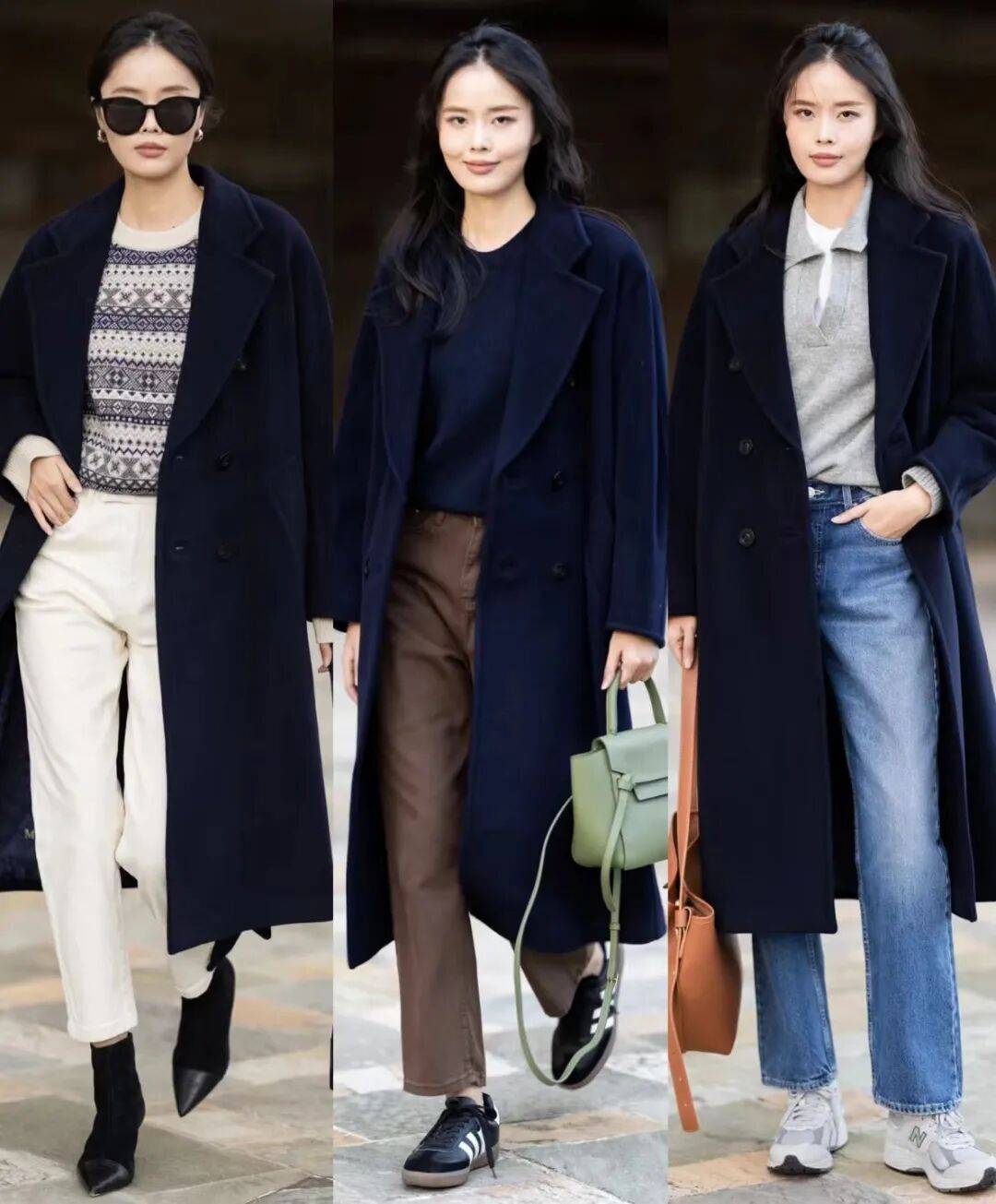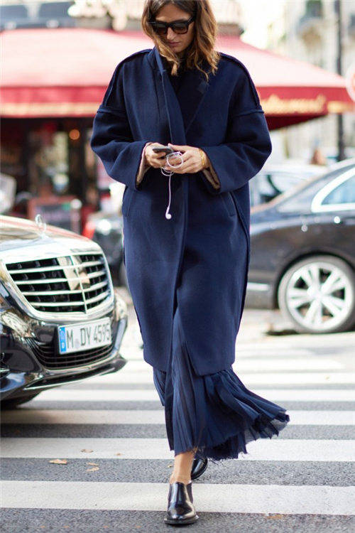 有时你也可以试试短一点的藏蓝色大衣,有的时候大衣短一截,也许会更时髦。