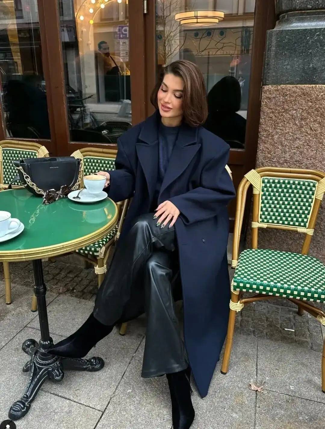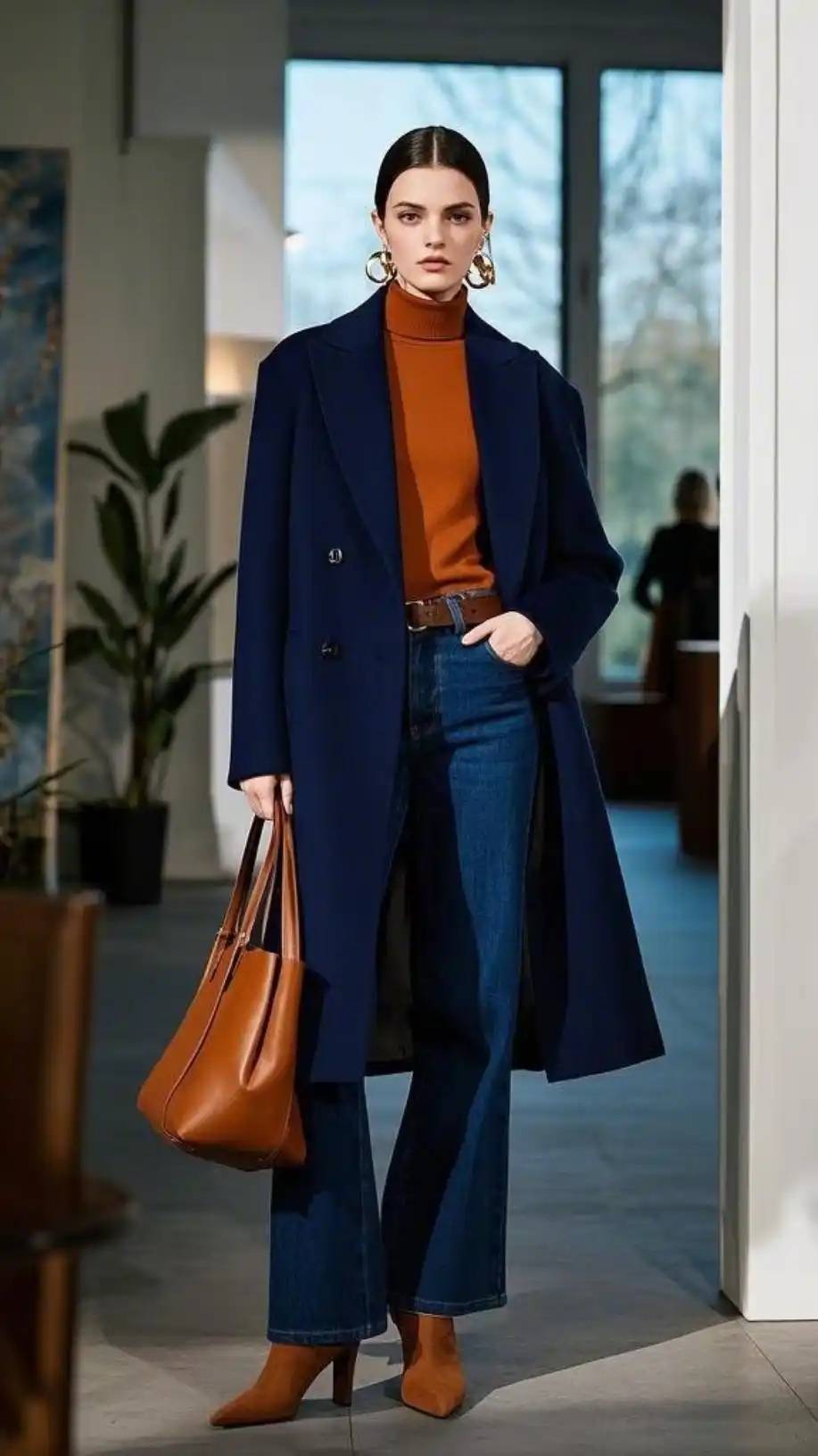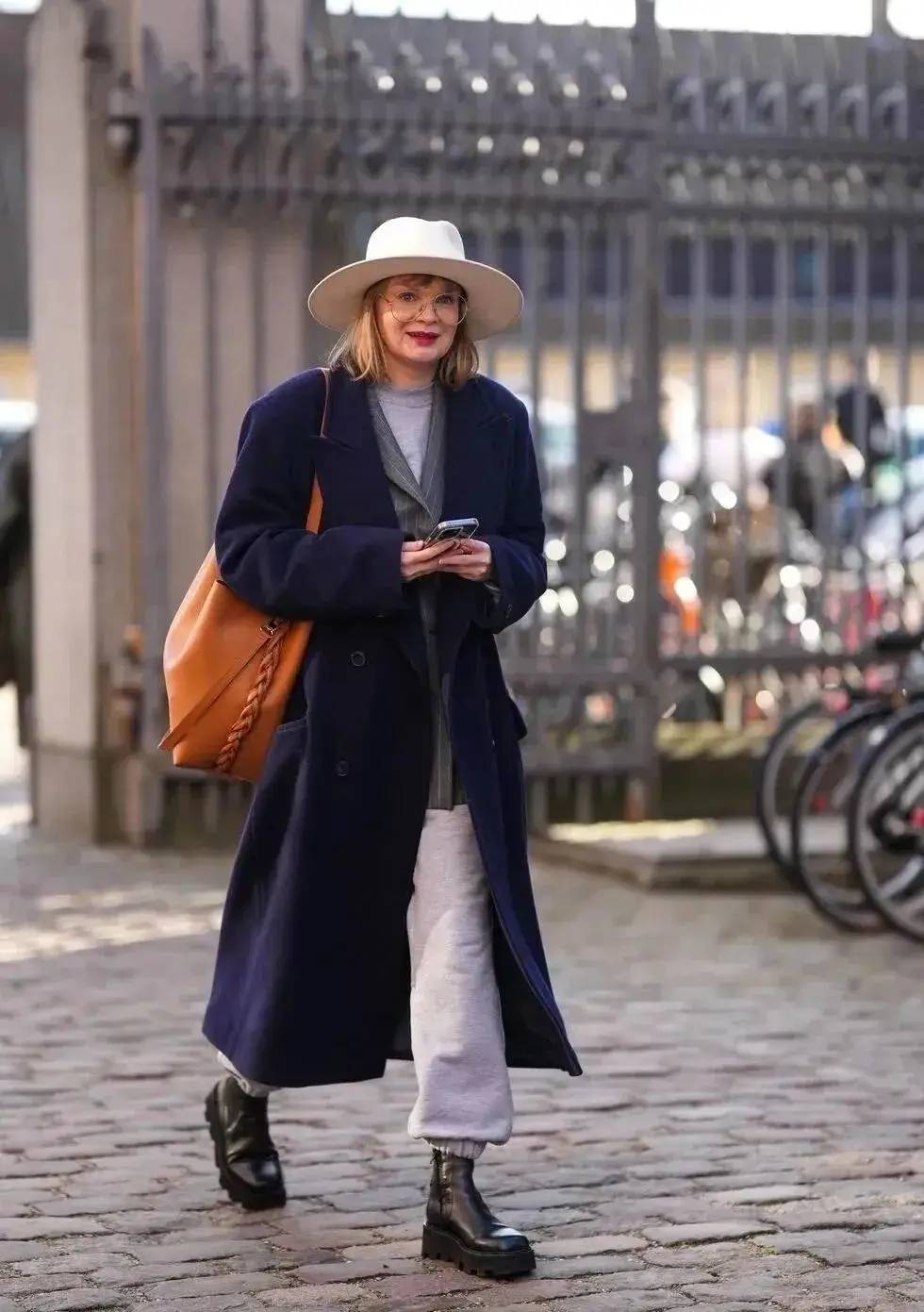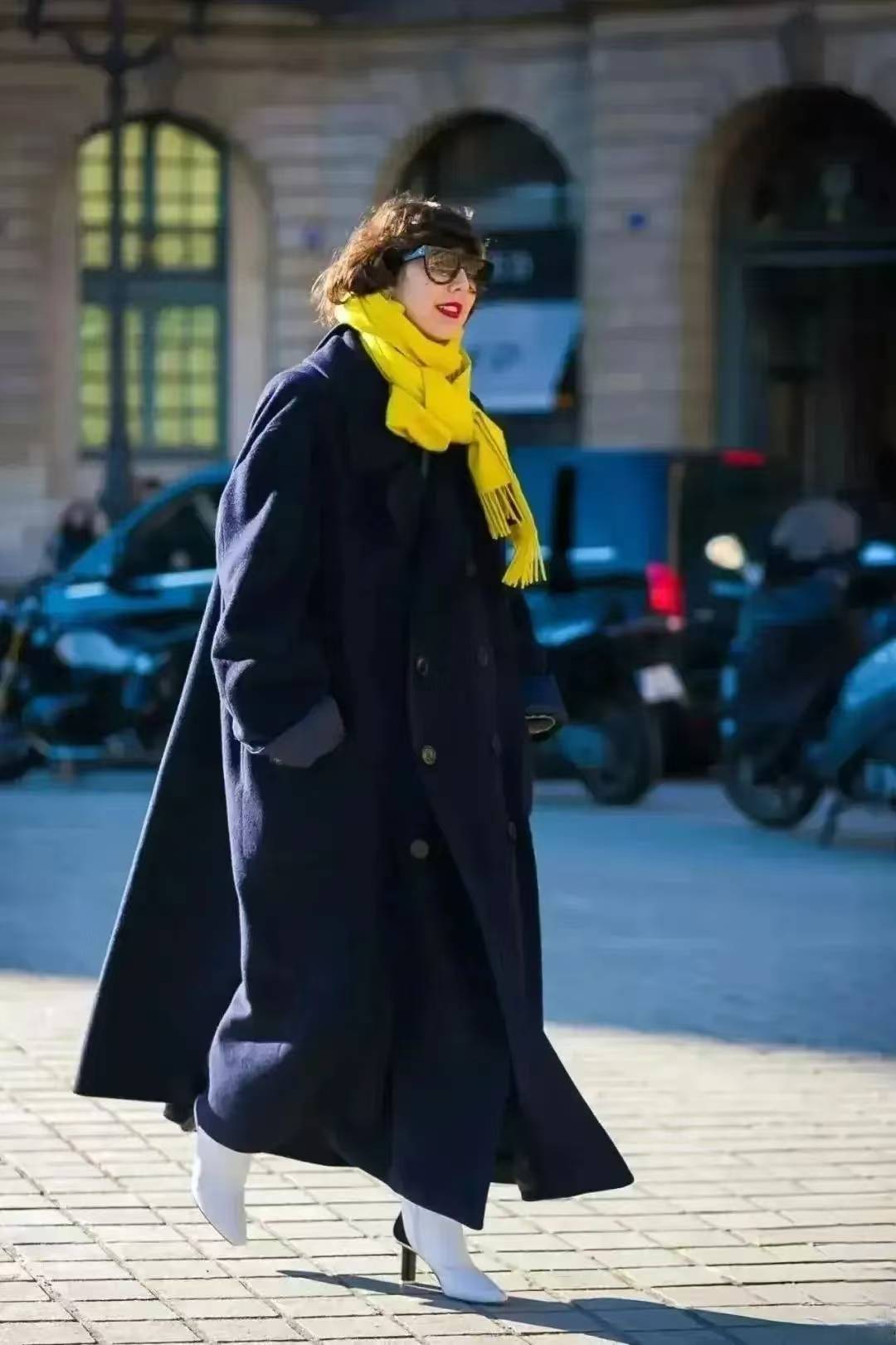 有时你也可以试试短一点的藏蓝色大衣,有的时候大衣短一截,也许会更时髦。