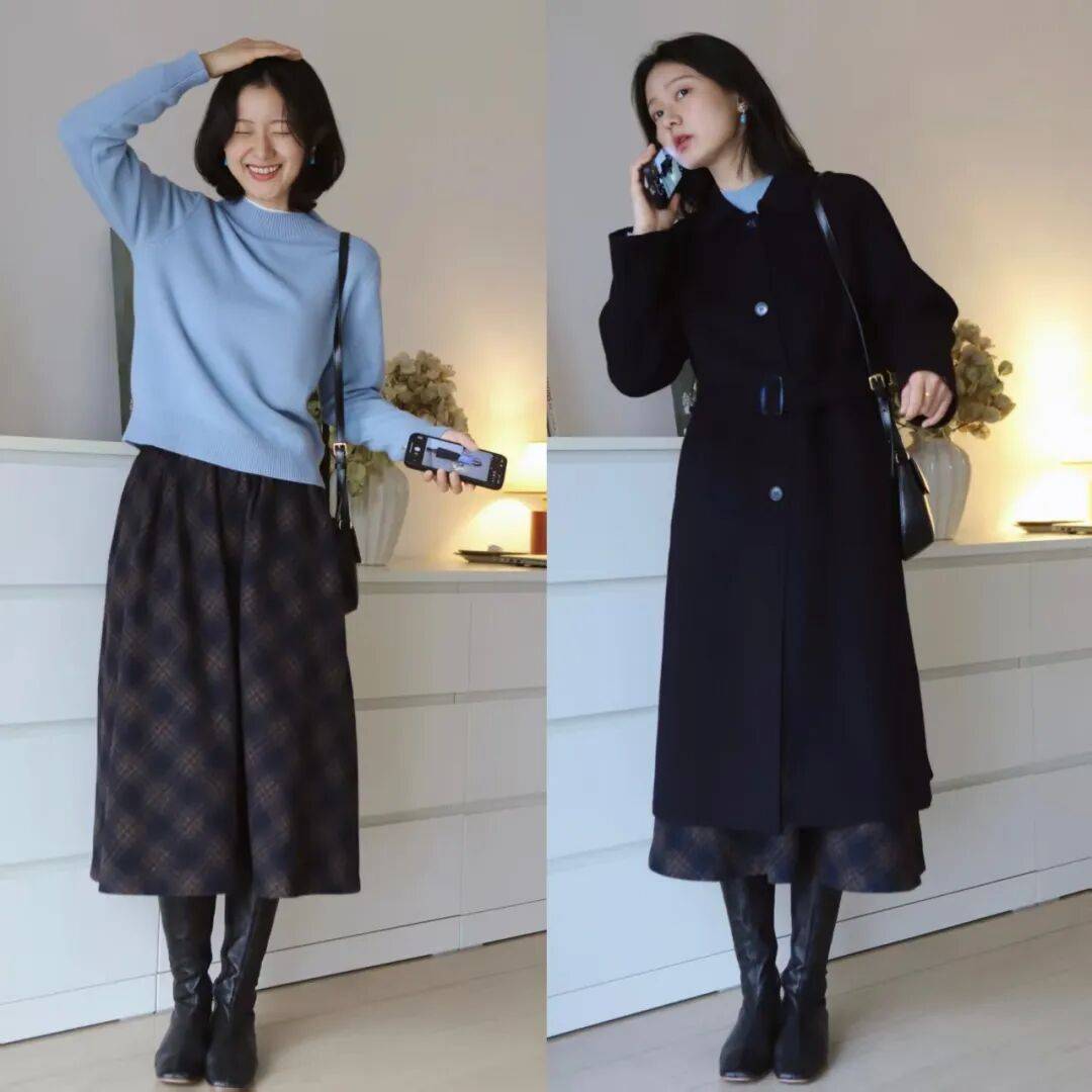小编就很喜欢用藏蓝色的大衣搭配黑色裙子,像上图左这位姐妹这样,长大衣搭配长裙,或者上图右这位姐妹这样,短大衣搭配半身裙,都非常高级优雅。
