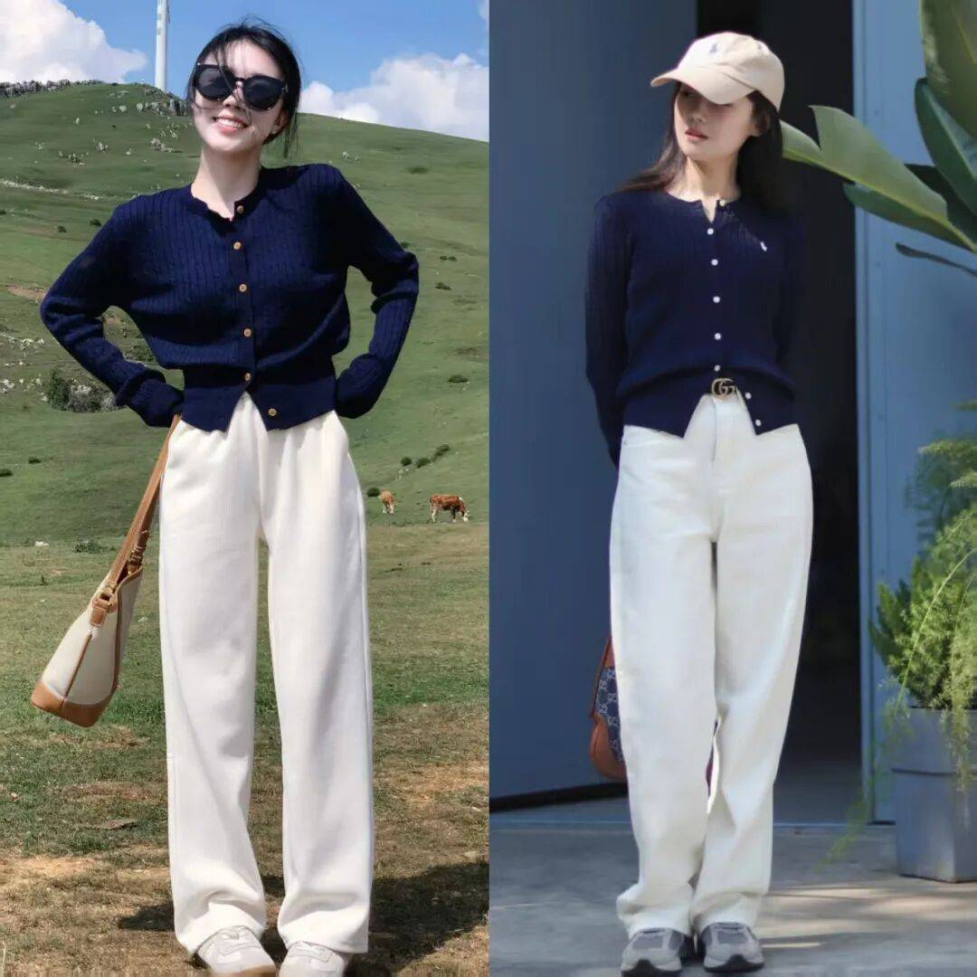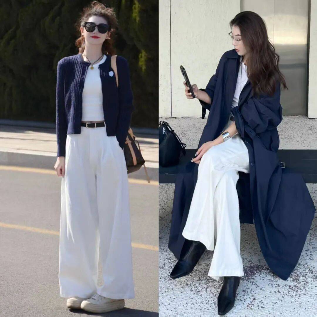 先来说说藏蓝色+白色,这组配色看起来非常清爽治愈,因为白色能平衡藏蓝色的深调,让整体穿搭不会显得压抑。
