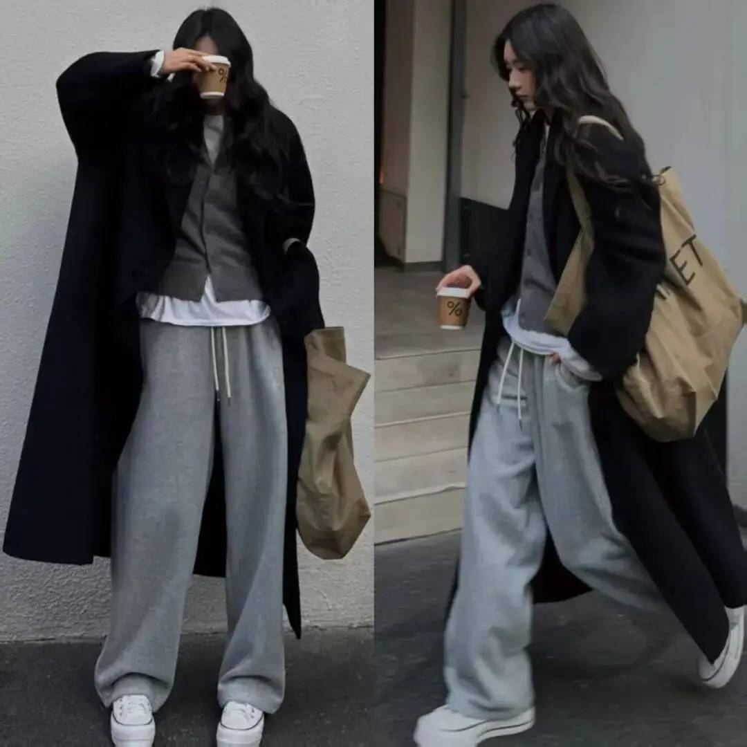 如果有这种担心的姐妹,可以用一些配饰点缀一下,就比如上图的姐妹,用灰色的内搭和灰色的裤子搭配藏蓝色的大衣。