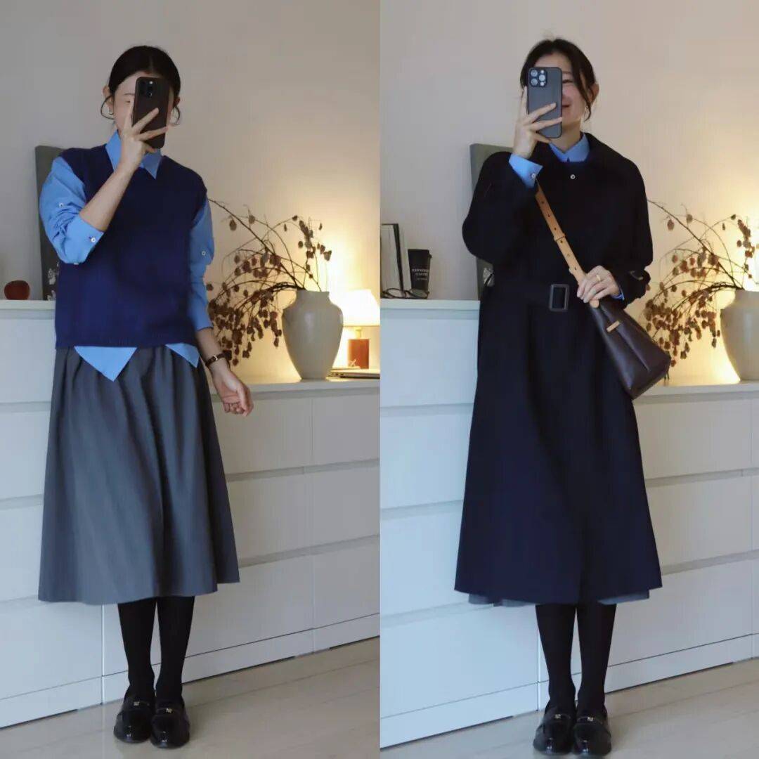 就比如上图这位姐妹,她就选择了一件浅蓝色的衬衫搭配藏蓝色的针织马甲,深浅交替能让穿搭更有看点,再搭配一条灰色的半身裙,让整体颜色过渡的更自然,还显得很文艺。