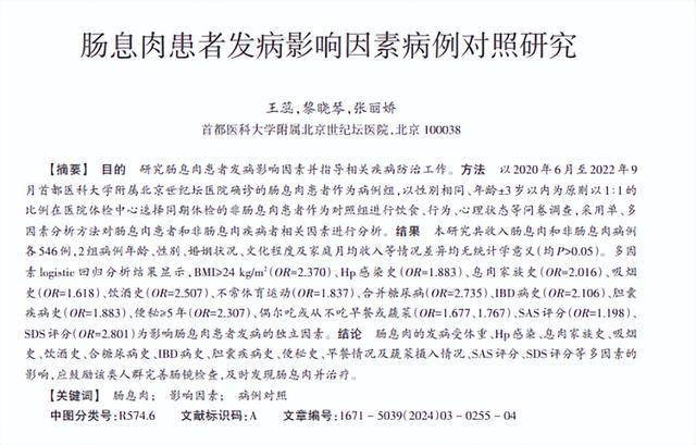 [1] 王蕊.肠息肉患者发病影响因素病例对照研究,华南预防医学,2024-03-20
