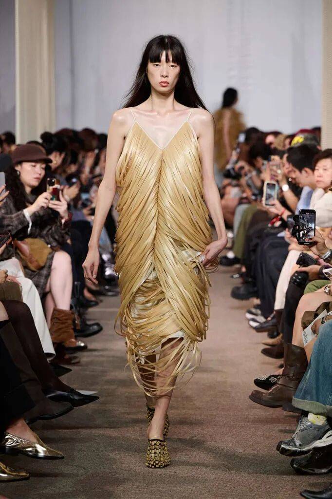 系列拒绝浮夸秀场美学,转而刻画城市生活的粗粝感:水泥灰调连衣裙搭配磨损感皮革腰封,灵感源自米兰老建筑墙体;金属配件模拟工业铆钉形态,却以圆润陶瓷重塑,隐喻刚柔并济的都市生存智慧。
