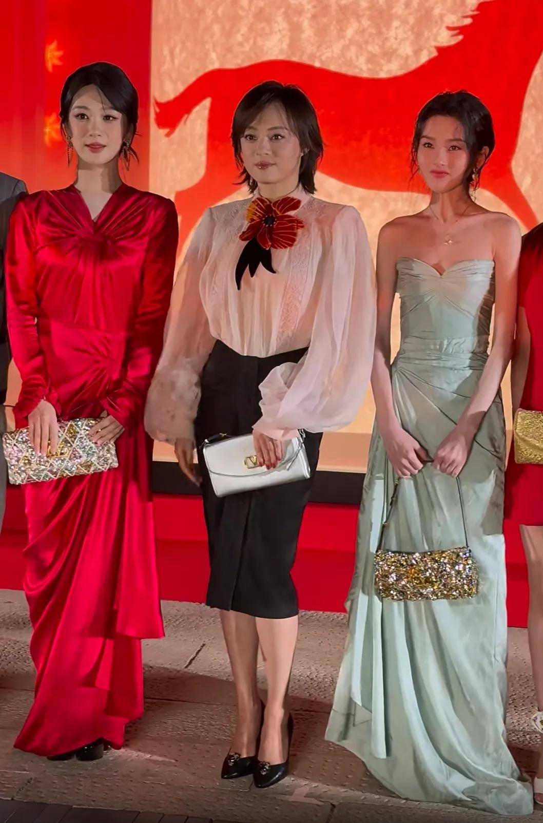 何超莲的造型选用品牌标志性的正红色长裙,搭配这银色高跟鞋,豪门千金的优雅气质拉满。