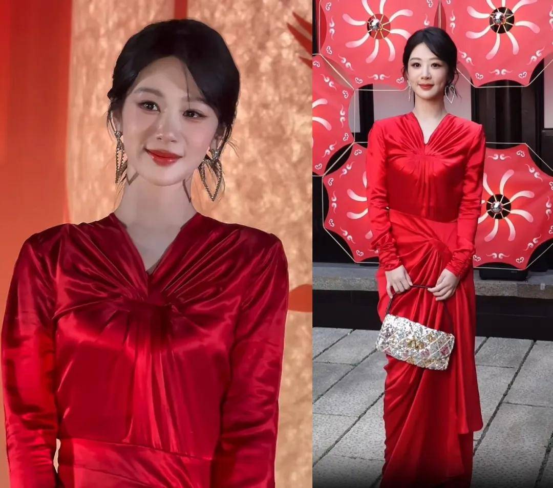 杨紫穿了一条皱褶红裙亮相,搭配超大的耳环,看着很喜庆。不过总觉得大红色的裙子不是那么好驾驭的,对她来说有些成熟了,尤其是她还拿了一个金银色的包搭配红裙,遮住脸的话会以为是40+女明星的穿搭。其实这一身造型更适合那些明媚大气的40+的女明星穿,比如刘涛、蒋勤勤等,更能穿出那种“国泰民安的美”。