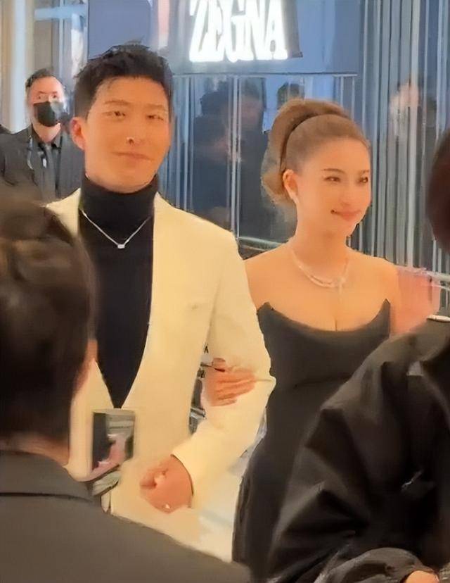 她的妆容精致,口红颜色与礼服呼应,但生图中嘴角线条平直,手臂自然下垂,与窦骁保持着微妙距离,全程没有主动挽靠的动作。
