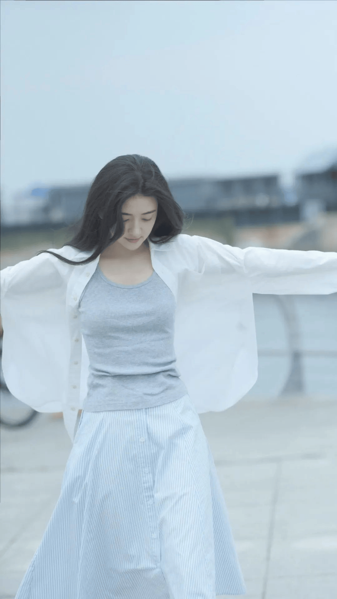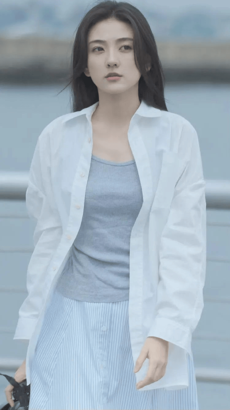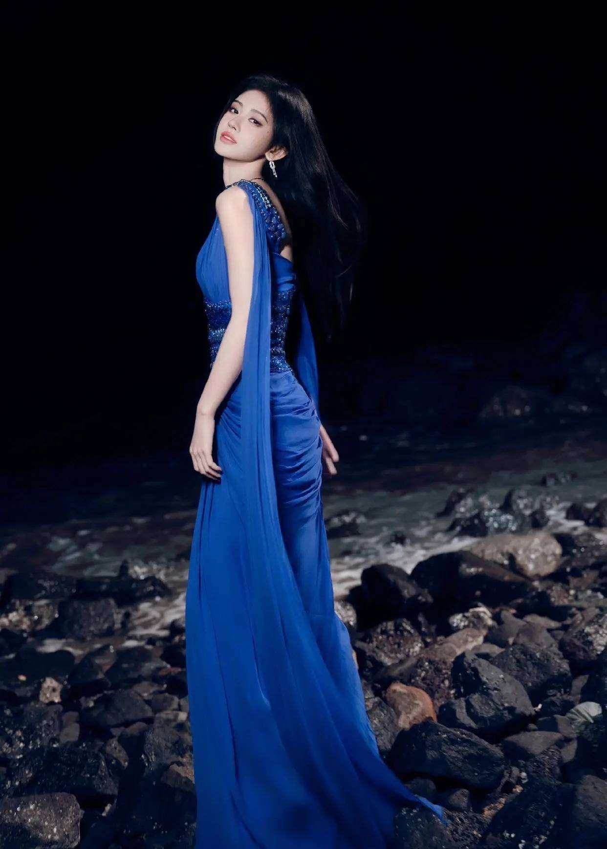 这条宝蓝色的单肩纱裙,宛如夜空中深邃的星辰,既神秘又迷人。裙子的设计极具匠心独运,单肩的款式完美地展现了鞠婧祎纤细的肩颈线条,仿佛一件精致的艺术品。腰间的亮片装饰像是点亮了整个造型,闪烁着迷人的光芒。宽大的裙摆随着海风轻轻飘动,仿佛与周围的海浪一起翩翩起舞。这条裙子,简直就像是为这片海岸线量身定做的,风姿绰约,极具韵味。