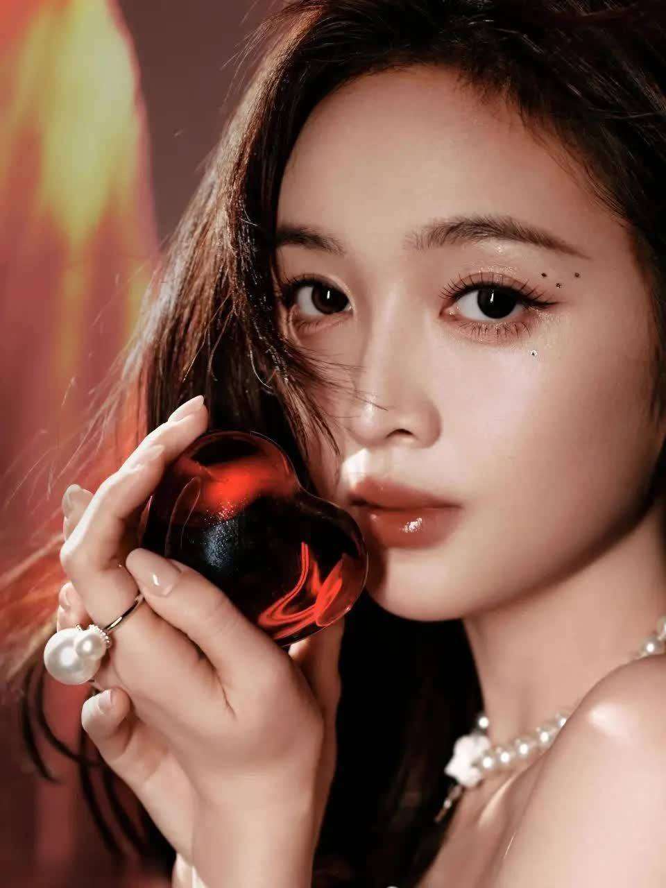 当镜头靠近,她眼尾上贴着三颗精致的钻石,唇上水光感的琥珀色唇釉,与指尖的珍珠戒指互相呼应,完美地融合进了礼裙的元素。她手中轻捧着那颗红心玻璃球,姿态慵懒又带着迷人的气质。长发垂落在她的手臂上,更衬得她那纤细如瓷的手腕显得格外脆弱而优美。这组特写的精妙之处就在于反差:甜美的五官是表象,而眼尾的钻石和唇间的冷调,正是她内心深处的野心的真实展现。