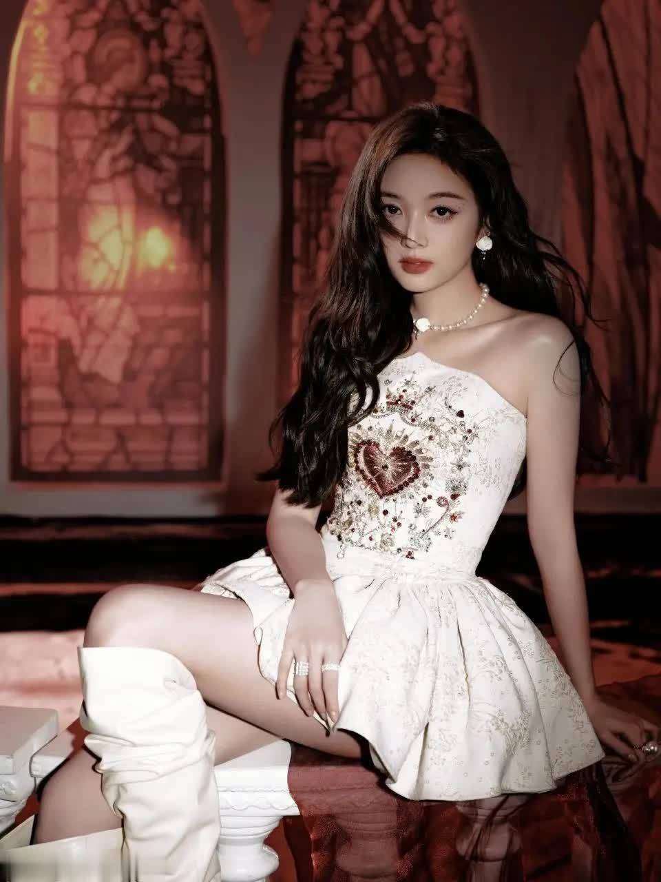 在镜头的捕捉下,她斜倚在雕花台边,长发轻轻垂落,正好掠过露肩礼裙的精致刺绣。谁能想到,身高166cm、体重仅42kg的她,竟然拥有令人称羡的完美腰臀比。她那如奶油般细腻的肌肤在暖色调的红光下散发着柔和的光辉,而她唇上涂抹的琥珀色唇釉,则瞬间为她的甜美面庞增添了几分冷艳。珍珠项链轻轻搭在她的肩颈间,锁骨深深凹陷,宛如盛满碎星的深邃夜空。礼裙上那颗红钻心脏刺绣,精巧无比,甜美的蓬裙成为她的底色,而缠绕着荆棘的心脏,则在无声宣示着她藏匿在软萌外表下的锐气与锋利。