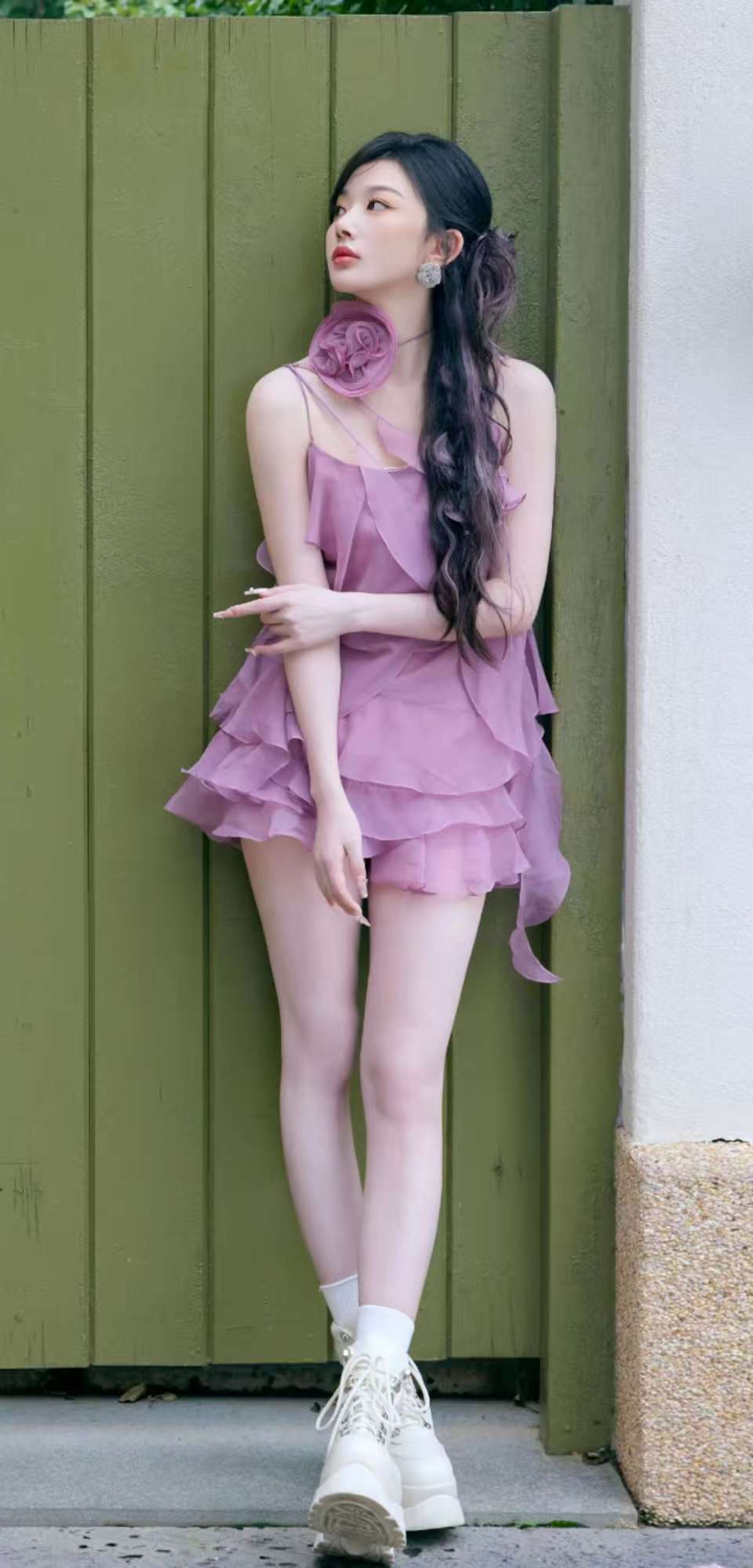 还有她蹲在花丛里那张!粉紫色吊带裙配白色厚底靴,又甜又酷的反差感直接戳中我!头发染成渐变紫,发尾还卷成大波浪,手里抱着一束紫玫瑰,这是什么迪士尼在逃花仙子啊?阳光洒在她脸上的时候,连绒毛都看得清清楚楚,皮肤白到发光!