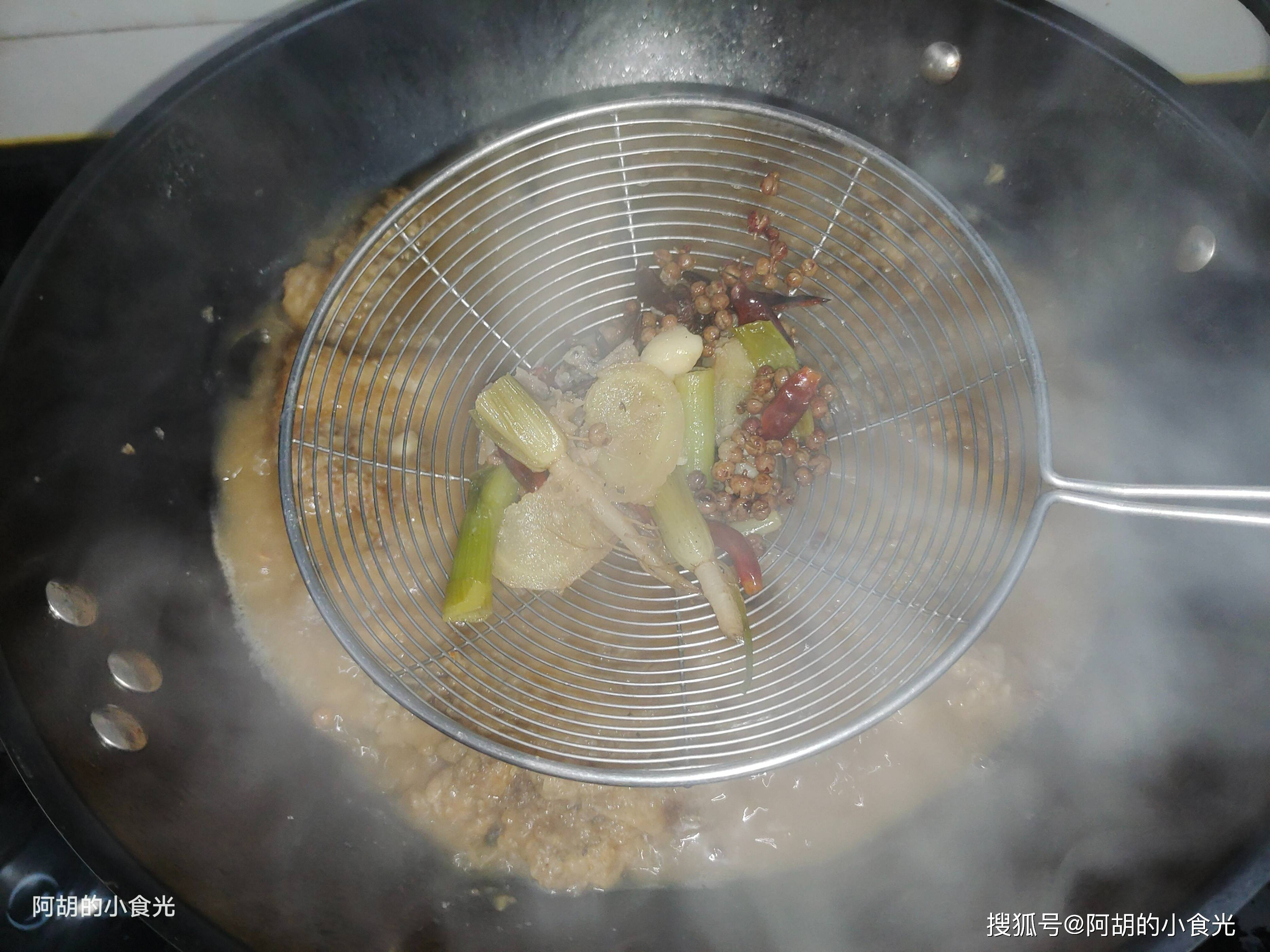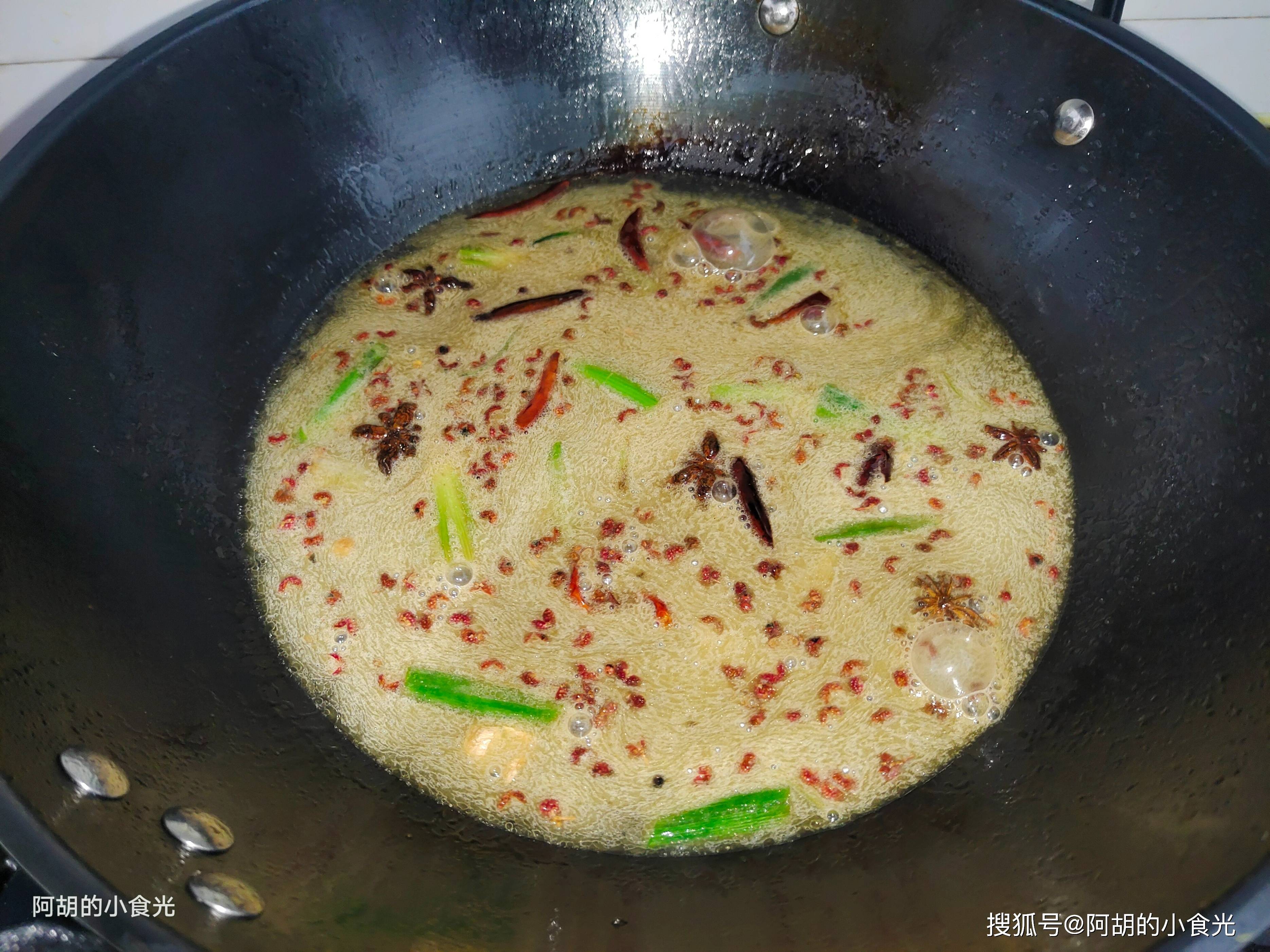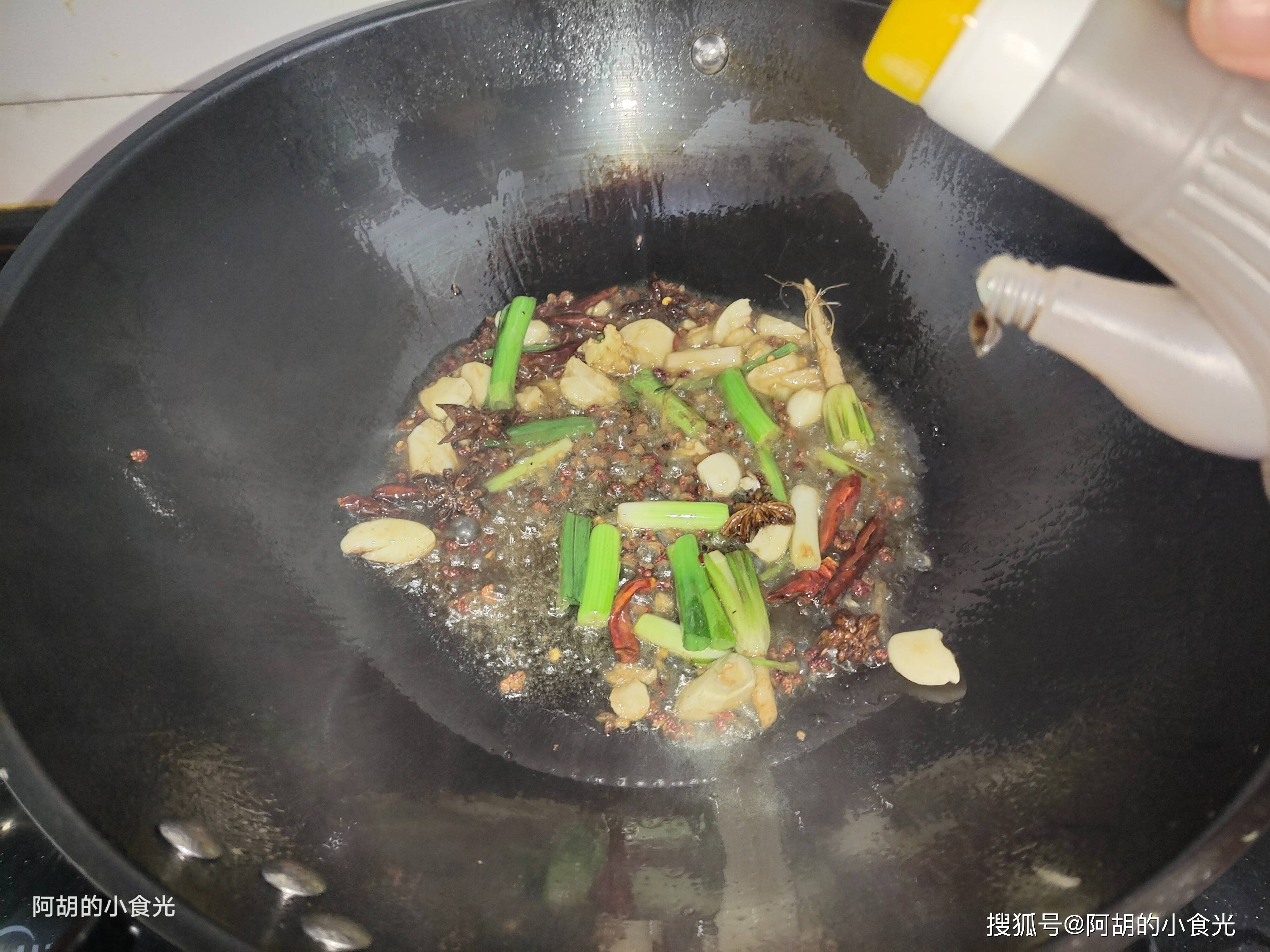 热锅冷油:菜籽油+猪油烧至六成热,下葱姜蒜、干辣椒、花椒、八角、香菜根。