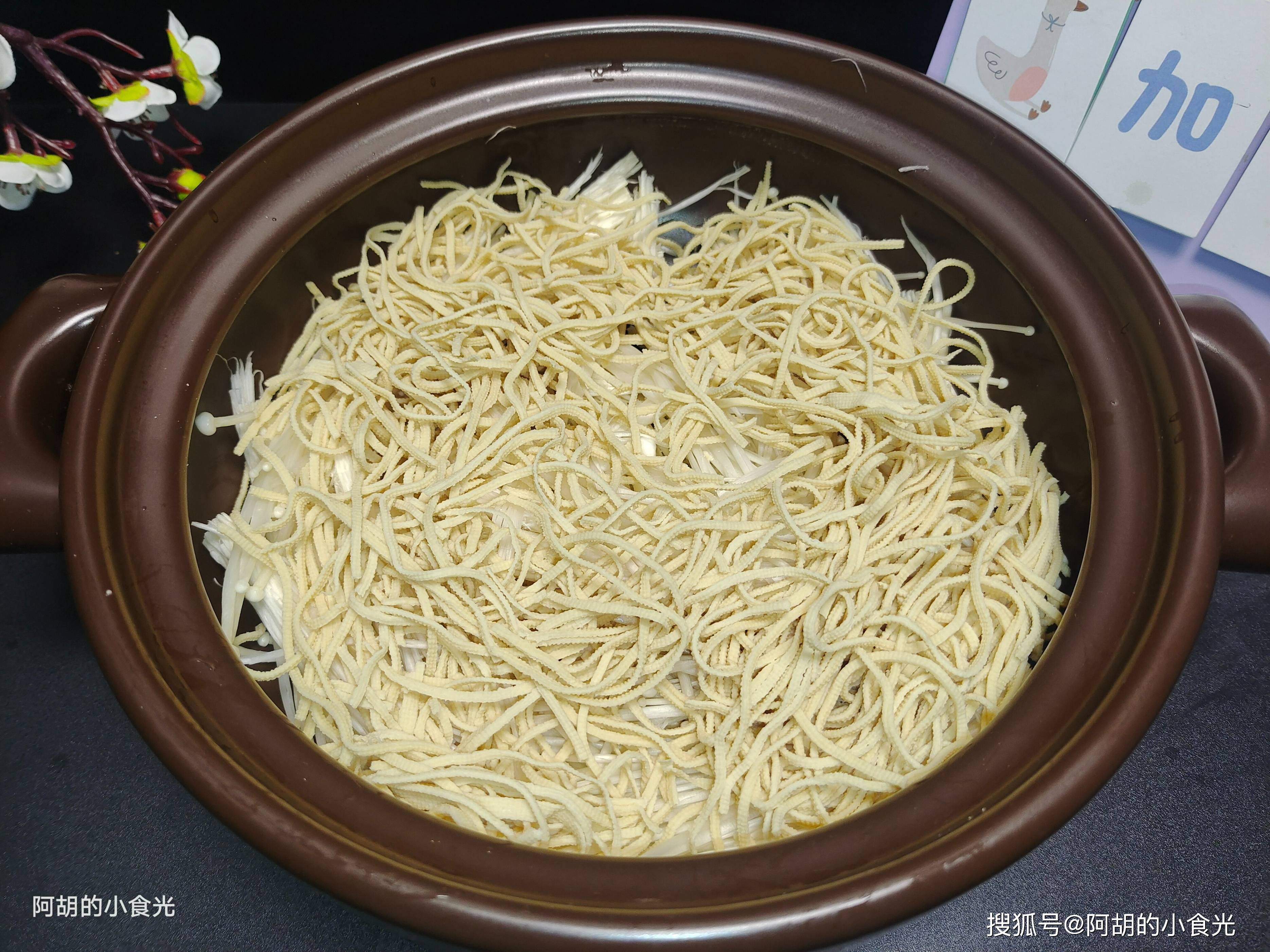 第三步:为了丰富这道菜的食材,吃起来有肉有菜,这里还准备了一些金针菇和一些豆腐丝,将这两者铺在砂锅的底部即可。你还可以根据自己的喜好选择添加一些粉条、平菇、娃娃菜等食材。