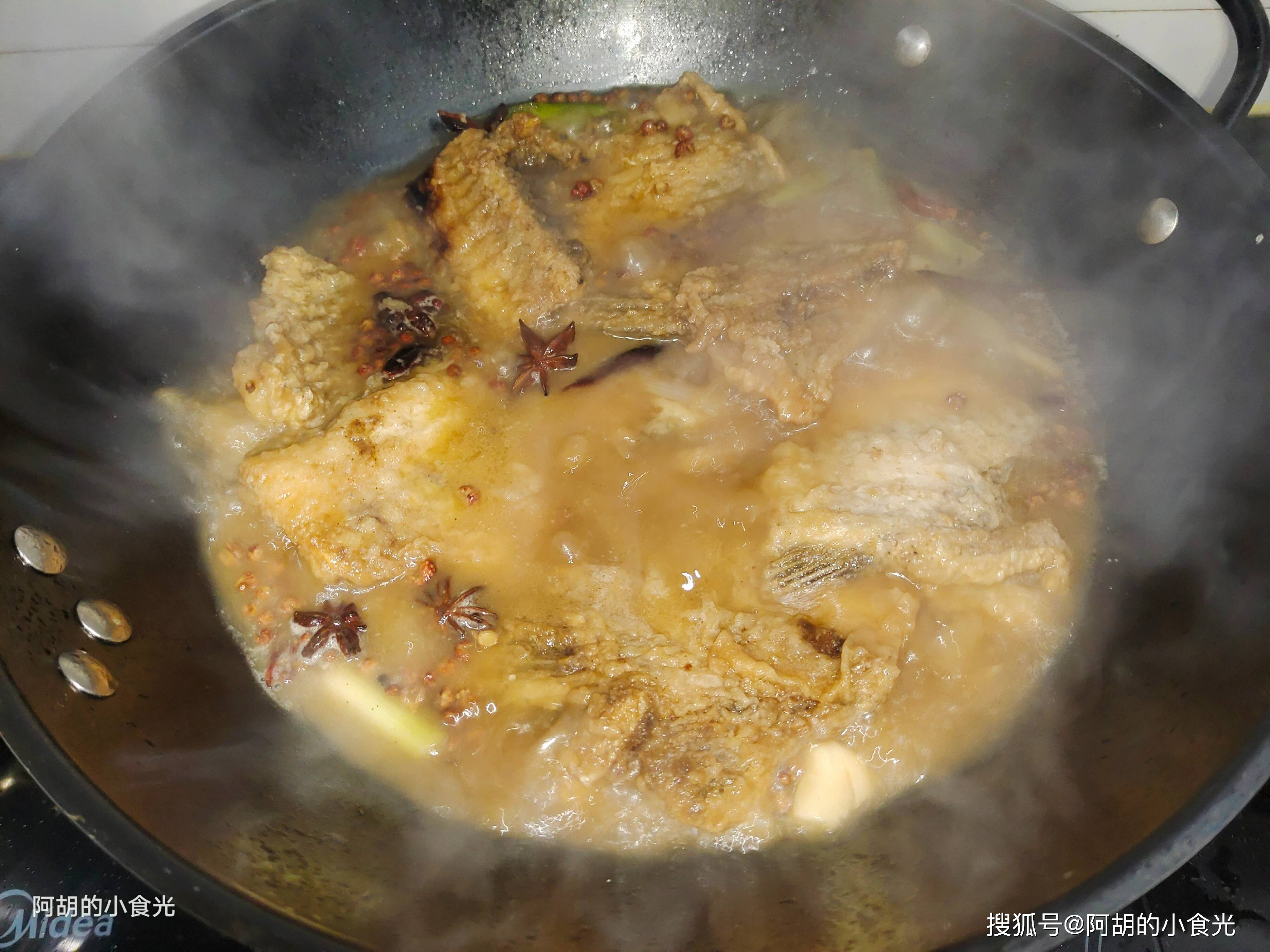 ③ 鱼回锅,加生抽/老抽/糖,热水没过炖15分钟;