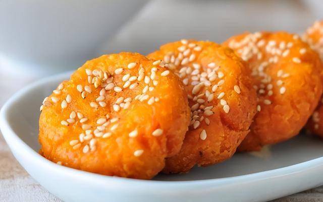 7、将面团分成若干小份,取一小份搓成圆球,用手按扁成饼。表面粘上适量的白芝麻。