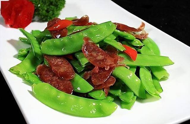 食材:荷兰豆、香肠、彩椒、蒜苗、葱、料酒、生抽、盐