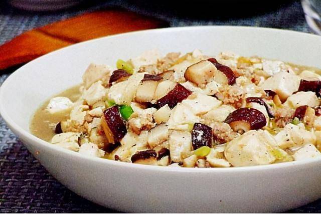 3.前腿肉剁成肉末,用油,盐,生抽,木薯粉腌15分钟。香菇切小块,豆腐切小方块,蒜苗切丁,小米椒切丁,蒜剁成蒜末.