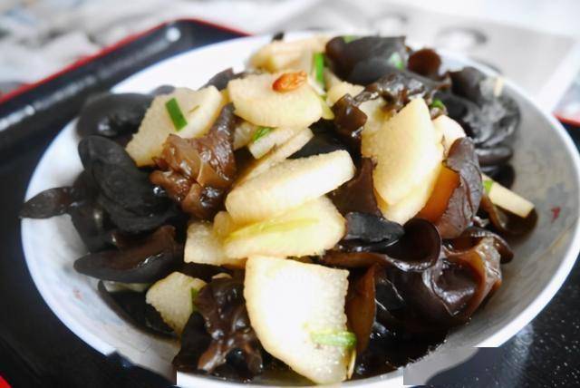 3、在锅中倒入油,放入姜丝爆香后先放入山药翻炒两三分钟,然后放入木耳,倒入用黄酒泡过的枸杞,黄酒也一同倒入,翻炒两分钟,倒入香葱、调入盐和鸡精翻炒均用后出锅盛盘。