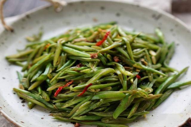 2、锅烧热下少许油,下花椒粒小火至香气出来,下入切好的扁豆丝,中火不断翻炒豆角又生绿变翠绿然后变成橄榄绿,变软了,这样豆角都彻底炒熟了,加入盐糖生抽炒匀调味即可。
