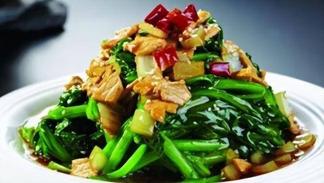 6.蒜苗、小米椒下炒锅炒熟,调入少许盐。
