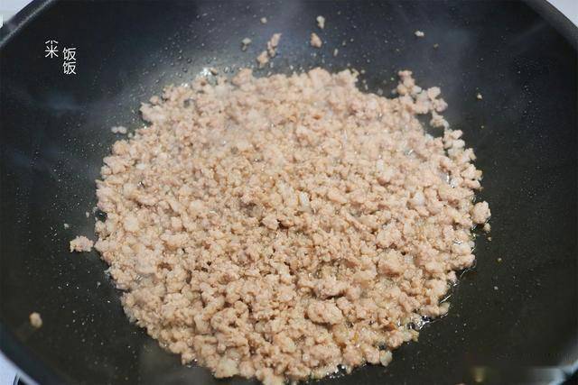 4,取一半肉馅,热锅凉油,放锅里大火炒,炒干水汽。