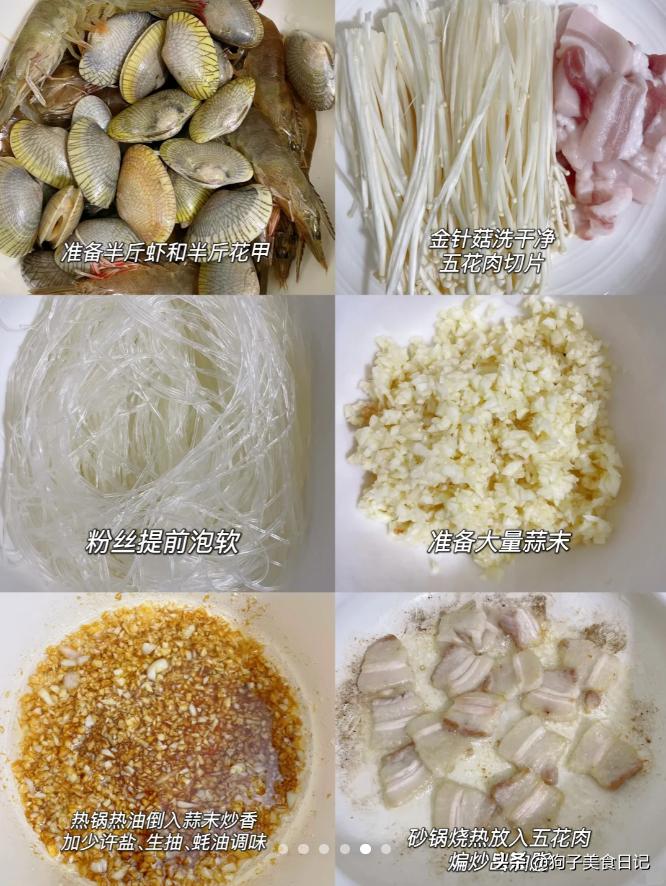 蒜蓉粉丝海鲜煲 材料:半斤虾,花甲,一把金针菇,一把粉丝,适量大蒜末,少许盐,生抽,蚝油,五花肉,葱花。