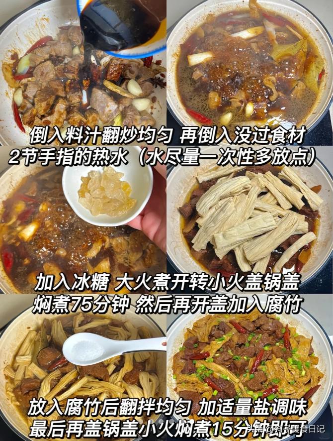 2.牛腩腐竹 材料:适量牛腩,20克冰糖,大蒜,生姜,大葱,八角,桂皮,干辣椒,香叶,300克腐竹,生抽,料酒,老抽,白胡椒粉。