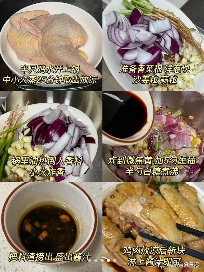 1 材料:半只鸡,香菜根,洋葱块,沙姜粒,大蒜,5勺生抽,半勺白糖。