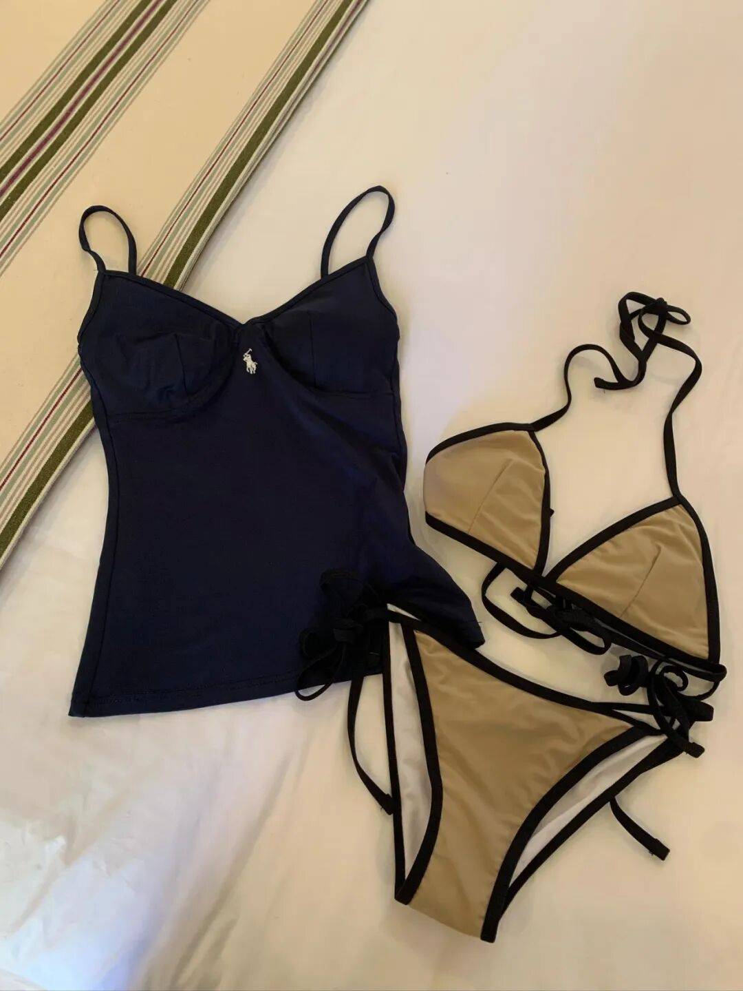 这套穿搭以清新自然的风格为主,适合夏日户外或度假场景。包括以下元素:上衣:深蓝色吊带比基尼式上衣,简约设计,展现休闲与时尚感。