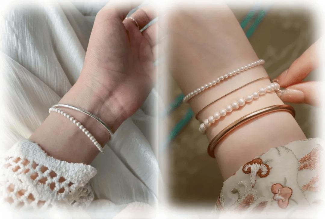 珍珠配金、银镯也是特别的和谐,衬托的对方都更加柔和透亮。