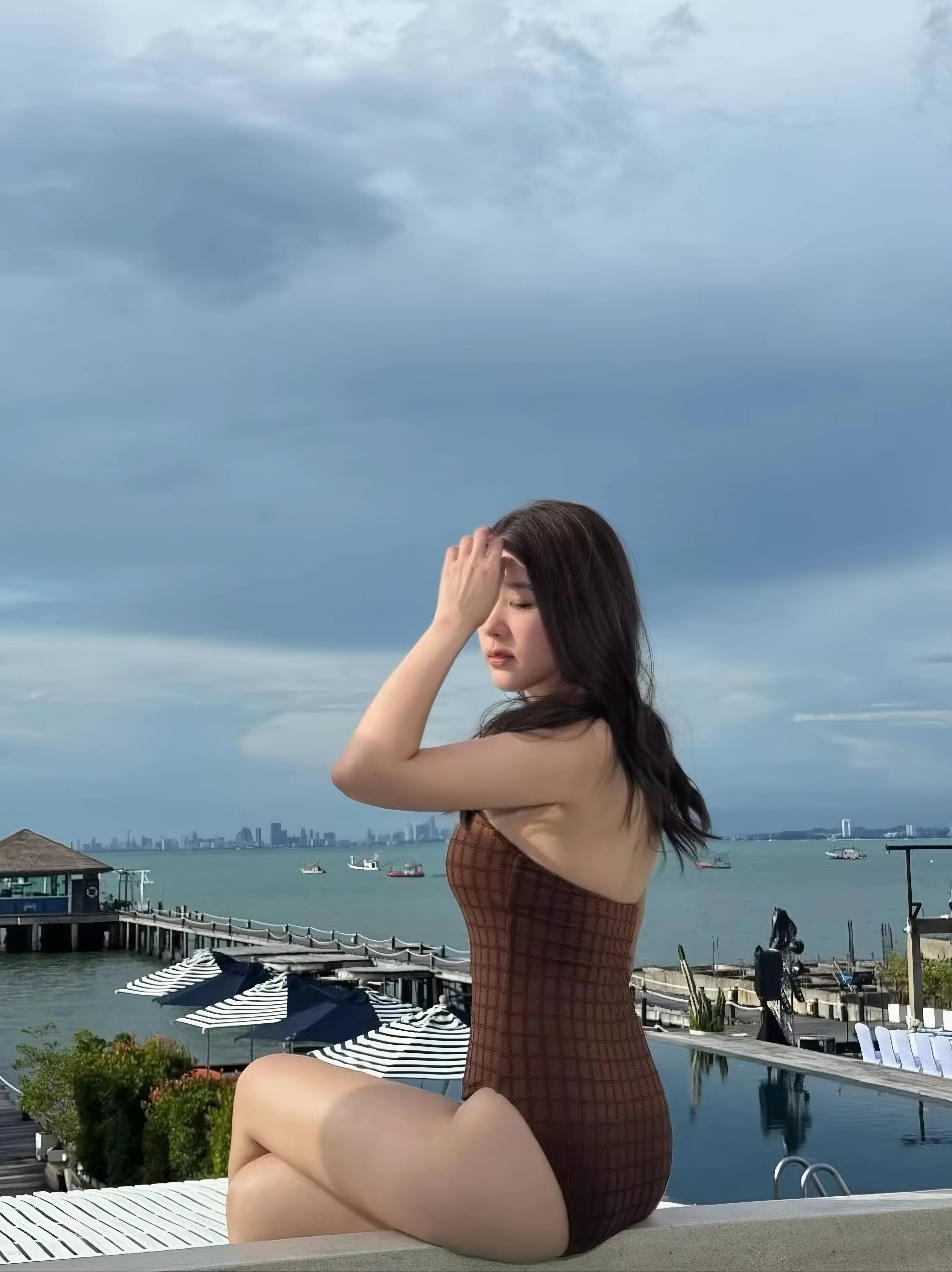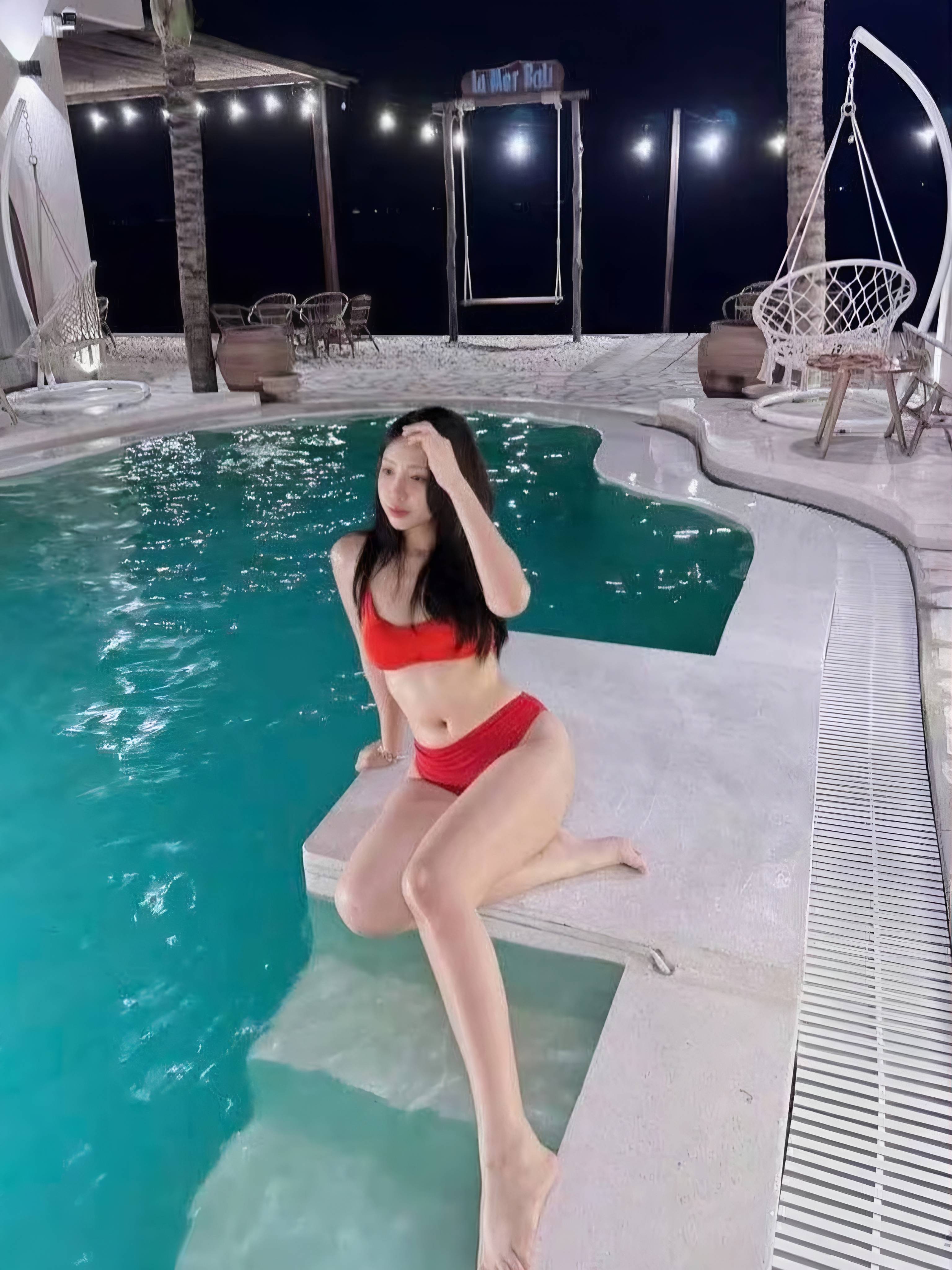 她闭眼立于水中,水波轻吻肌肤,身后建筑透出暖光,白色纱帘随晚风浮动。那一刻的静谧,仿佛能听见星光坠入水面的声音。转而坐在池边,赤足轻点水面,指尖掠过发丝,身后棕榈树与串灯交织成浪漫背景——每一帧都是热带夜的诗意注解。水珠从湿发滚落,红色比基尼在蓝绿色水光中愈发耀眼。或倚或立,每一个转身都勾勒出慵懒与优雅的平衡。这不是单纯的戏水,而是与夜晚、与自我的一场坦诚对话。原来最美的度假,是成为夜色本身,自由,生动,无需被定义。