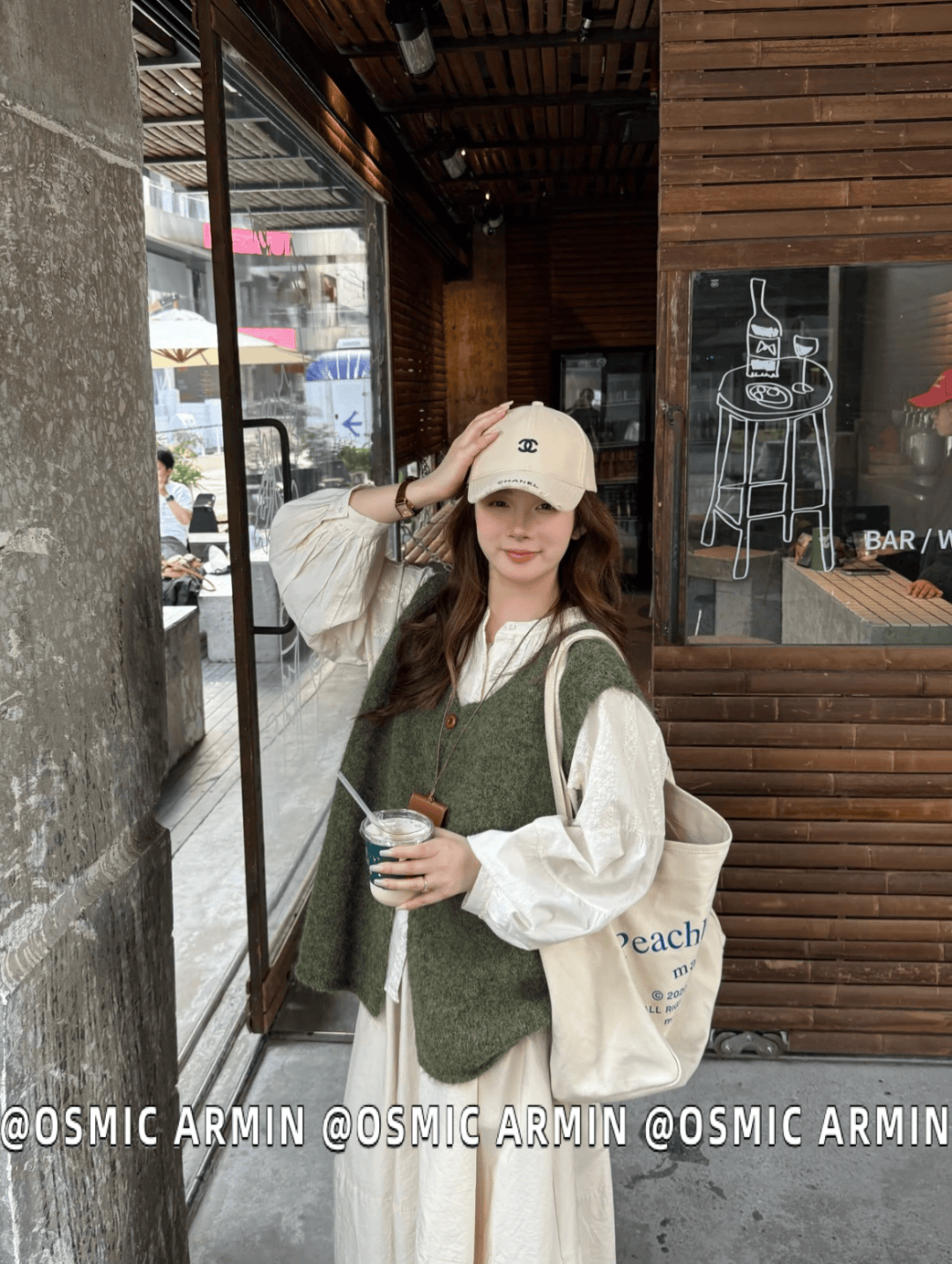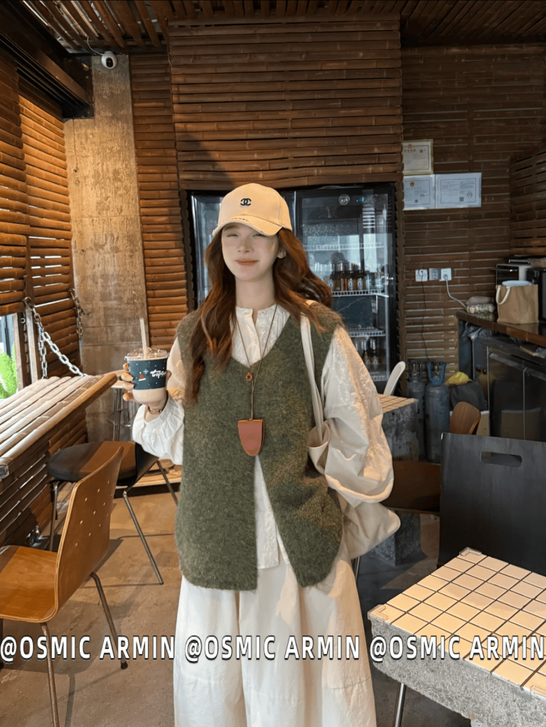 尤其领口的木扣细节感拉满,和马甲的复古感呼应起来,整个穿搭调性一下就统一了。