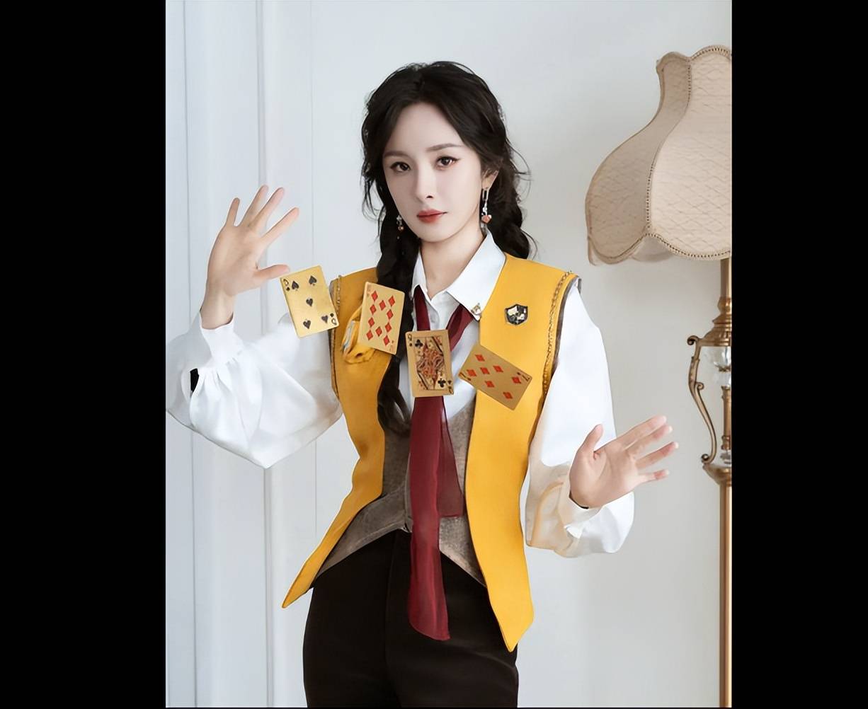 在这组充满魔幻色彩的照片中,杨幂化身优雅的扑克牌魔术师。她身着明黄色马甲,内搭白色衬衫和黑色领带,整个人散发着迷人的魅力。最引人注目的是她灵巧的手指间飞舞的扑克牌,配合她标志性的双麻花辫造型,既有专业魔术师的范儿,又不失少女的灵动。镜头下的杨幂身材纤细有致,特别是那盈盈一握的腰线,更添几分优雅气质。