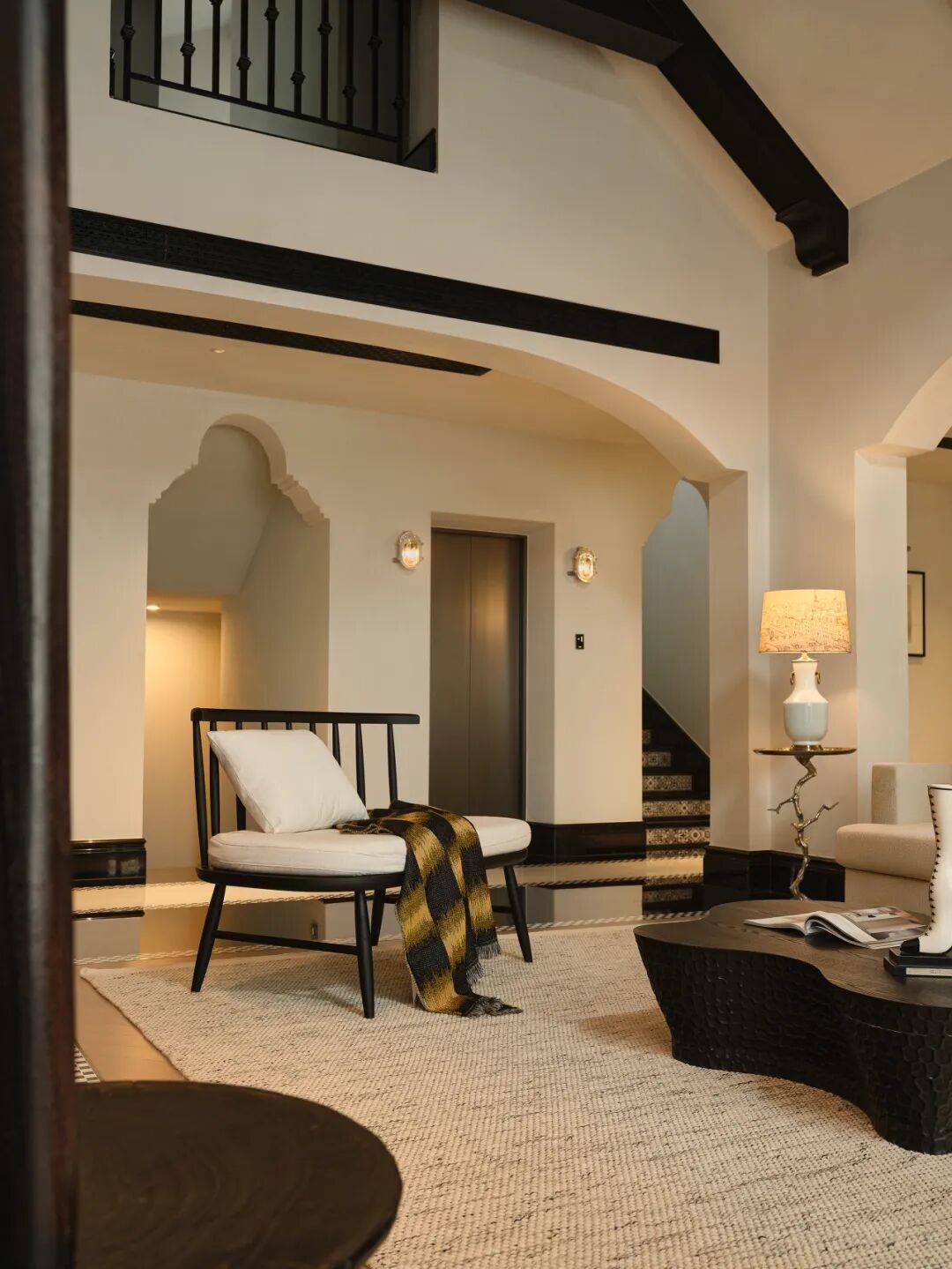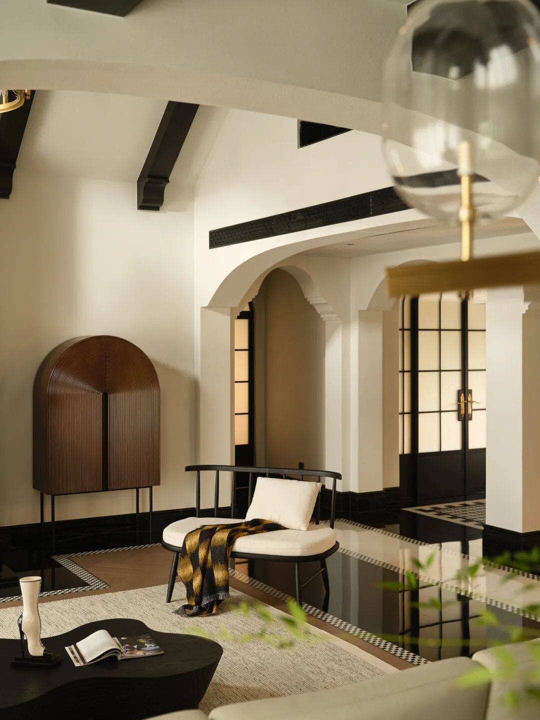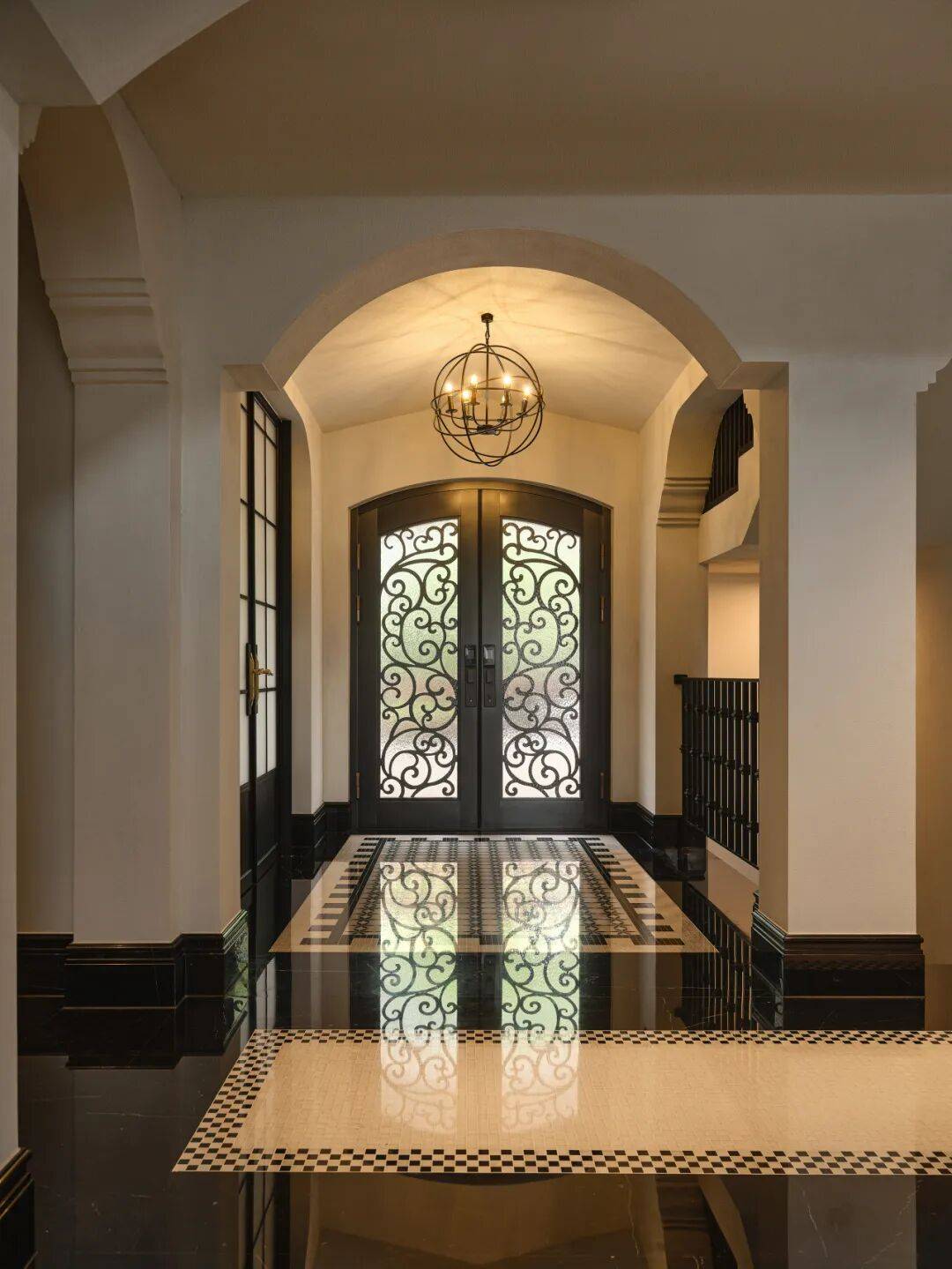 02. 空间叙事 每个角落,都是一幅画 一层空间 进厅:光影写就的欢迎礼 黑白拼花地砖如琴键般铺展,迎接归家的第一步。墙面艺术漆,搭配做旧金属壁灯,在光影交错中书写第一首欢迎诗。拱形门洞将视线引向深处,空间叙事由此展开。