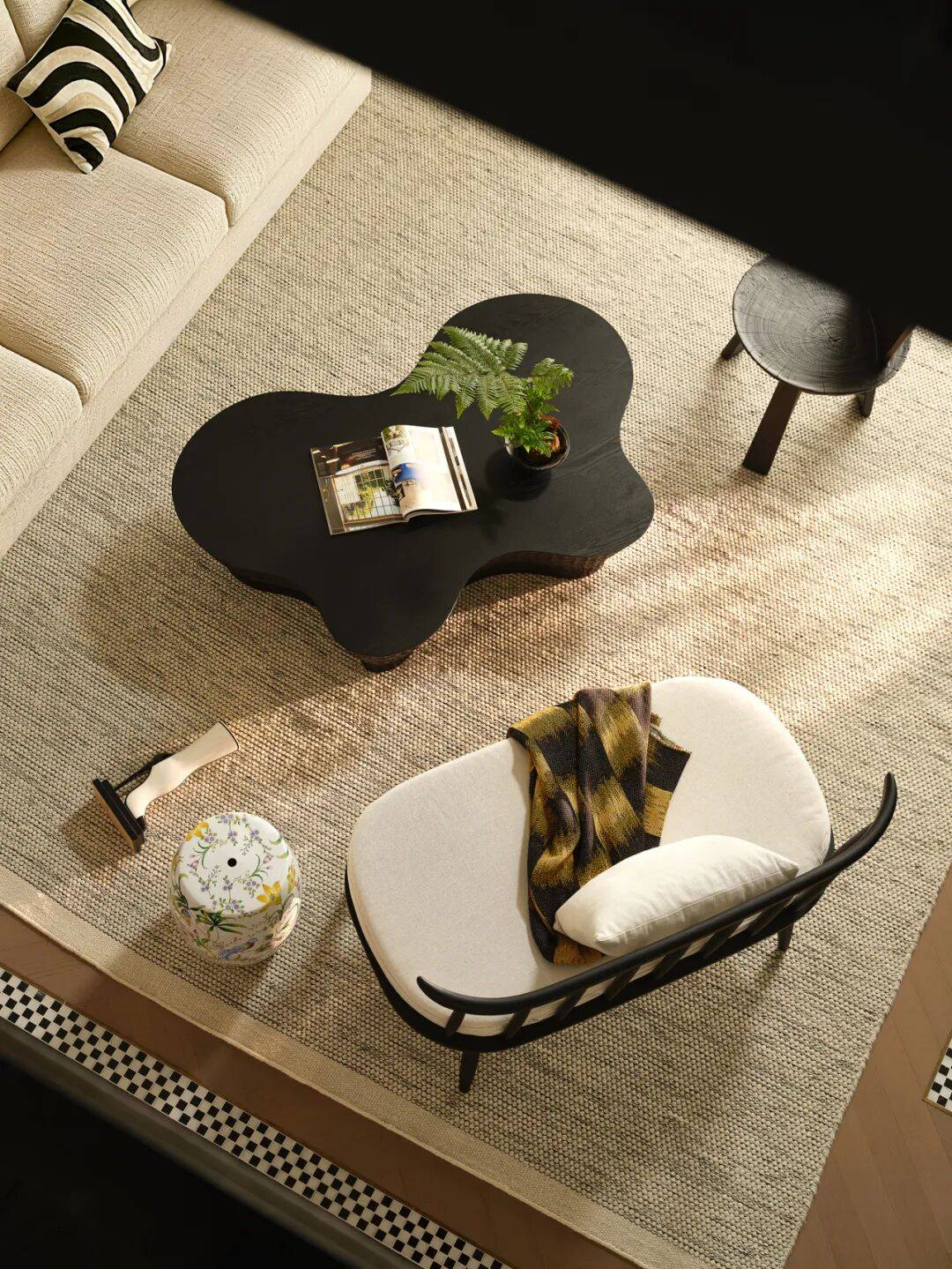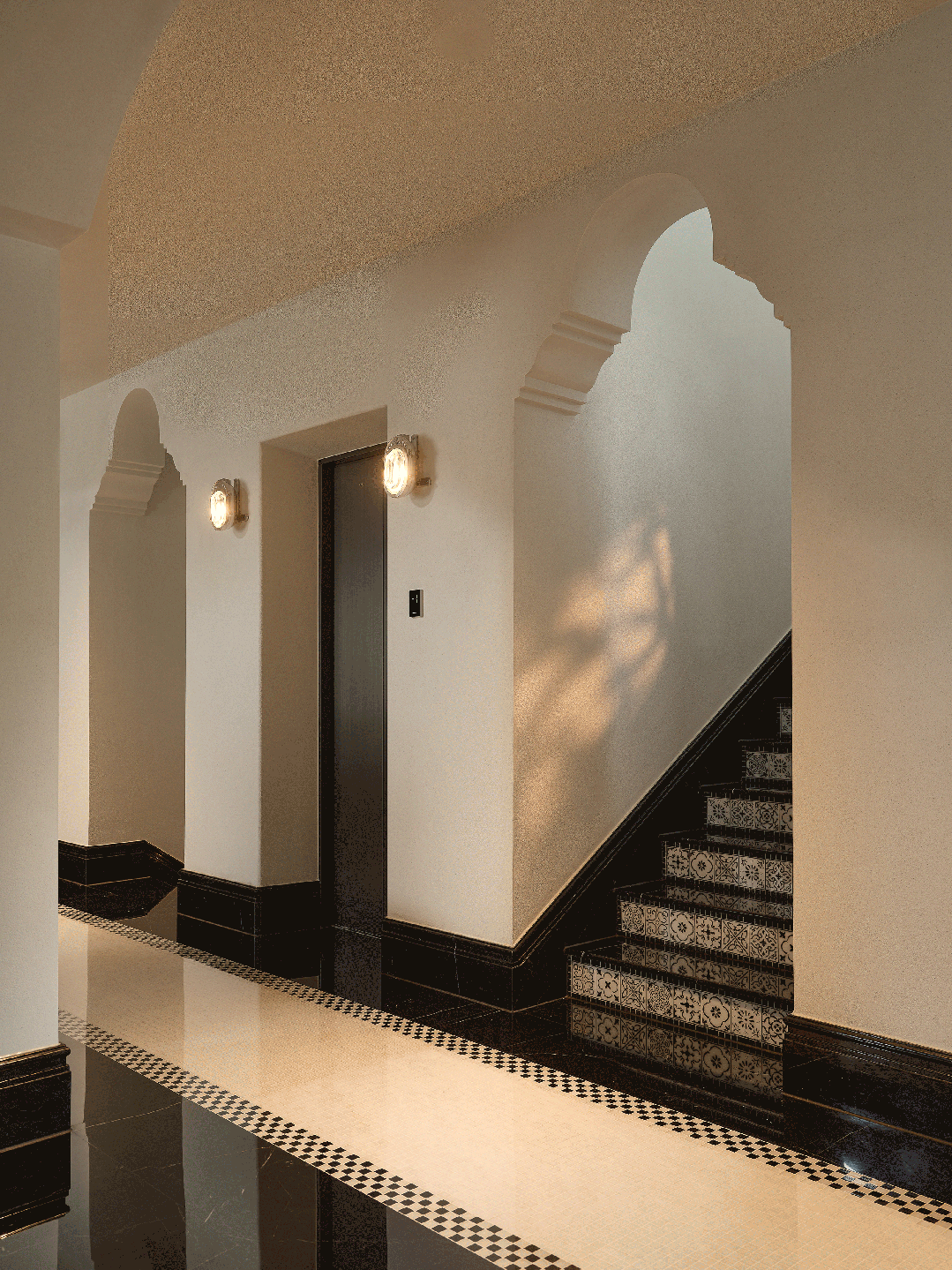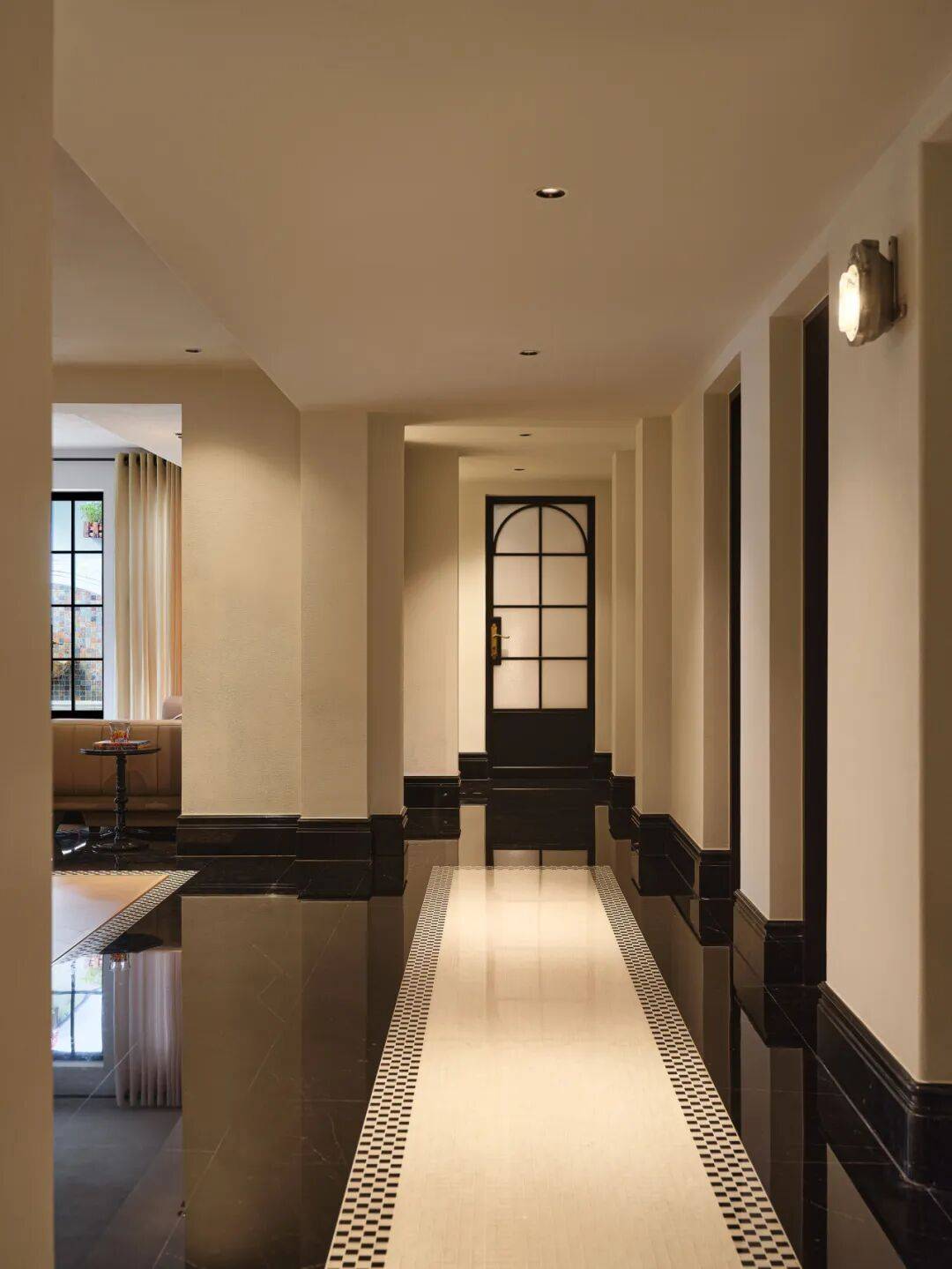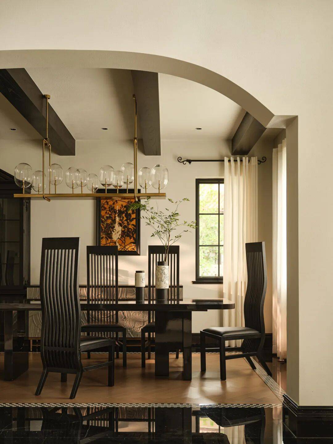 02. 空间叙事 每个角落,都是一幅画 一层空间 进厅:光影写就的欢迎礼 黑白拼花地砖如琴键般铺展,迎接归家的第一步。墙面艺术漆,搭配做旧金属壁灯,在光影交错中书写第一首欢迎诗。拱形门洞将视线引向深处,空间叙事由此展开。