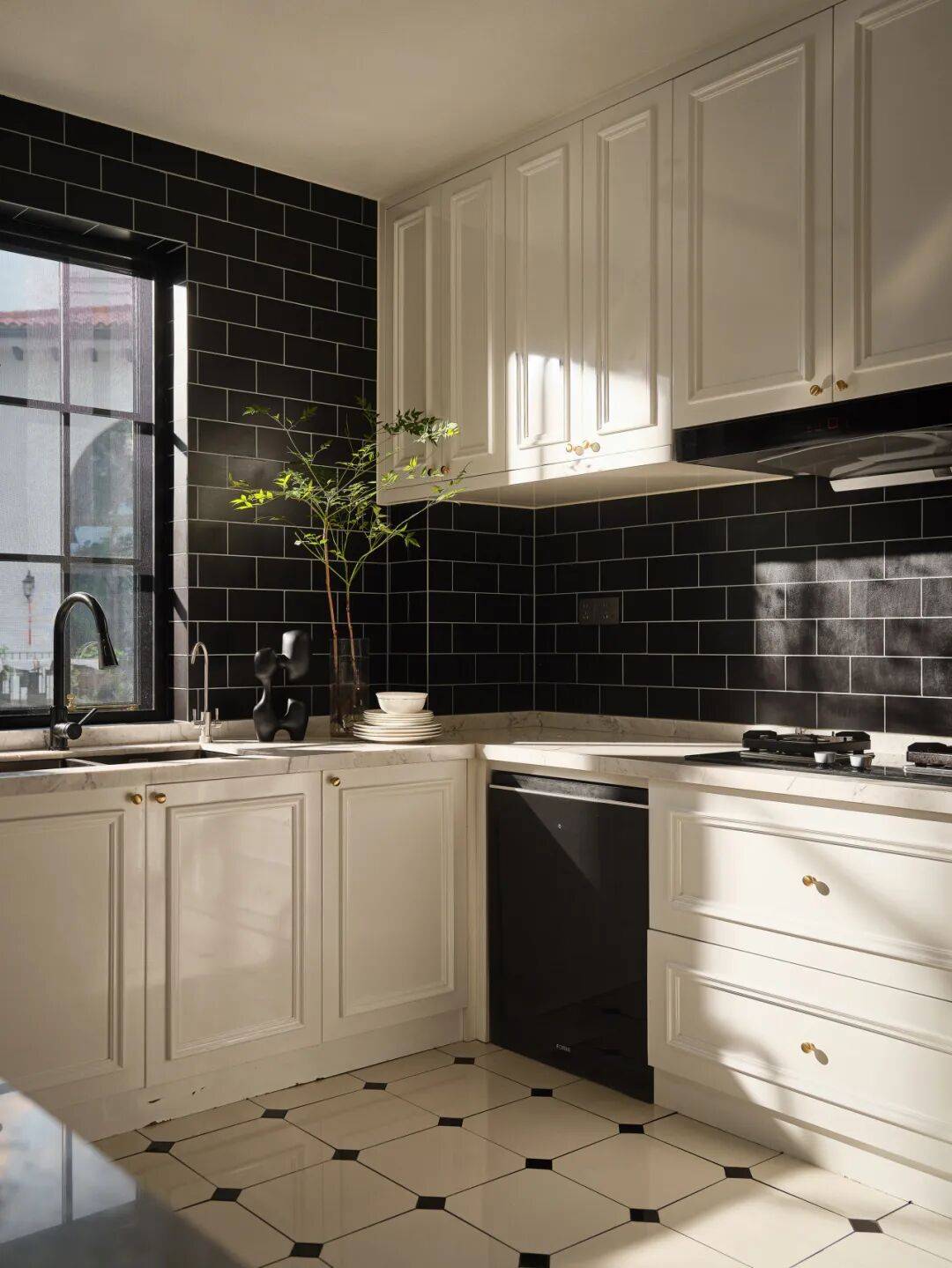 餐厨区:烟火与艺术相遇的地方 餐厨区采用开放式布局,与客厅通过一道优美的拱形门洞相连。做旧橱柜,像是地中海的波浪轻轻拍打海岸。手工彩绘瓷砖上是几何与花卉的交织,仿佛毕加索笔下的线条与色彩,在烟火气中重生。 实木长桌上,一束橄榄枝、几只陶罐,简单却充满仪式感。在这里做饭、用餐,不再只是日常,更是一场与艺术同行的生活仪式。