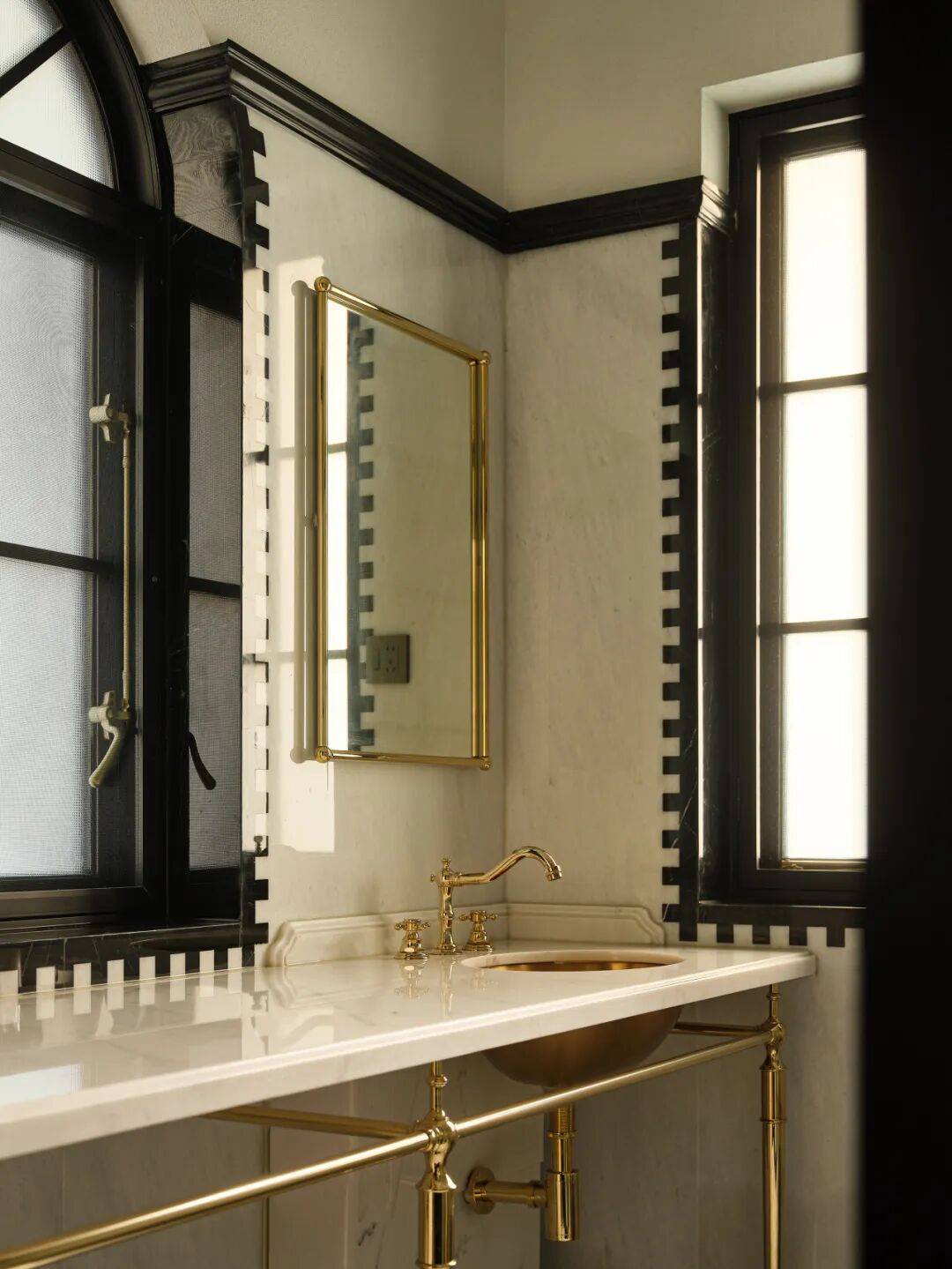 大理石与手工瓷砖拼接出如海岸线般的脉络。黄铜龙头滴落的水珠,像是地中海沿岸的晨露。镜前一盏锻铁壁灯,照亮每一个清晨与夜晚的仪式。