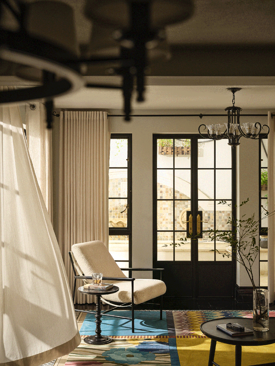 一曲弗拉明戈的现代变奏曲 阳光透过拱廊,在墙面上投下温柔的光影。陶土花砖沿着时光的纹路蔓延,铁艺吊灯轻声吟唱着来自地中海的歌谣。这是一场穿越时空的对话——西班牙的热情与上海的老洋房,在此相遇、相融、相生。 项目视频 01. 缘起 当西班牙的风,吹进上海的窗 接手万源城这个项目时,建筑已然是一首写在地中海边的诗。纯手工打造的STUCCO墙面、历经打磨的大理石拼花、还有那些弧度优美的筒瓦……它们静静地诉说着来自南欧的阳光与海风。而我们想要做的,是在室内延续这首诗——不仅要有西班牙的热情奔放,还要有上海老洋房里那种时光沉淀的优雅与从容。 于是,一场关于空间、光影与记忆的艺术创作,悄然开始。