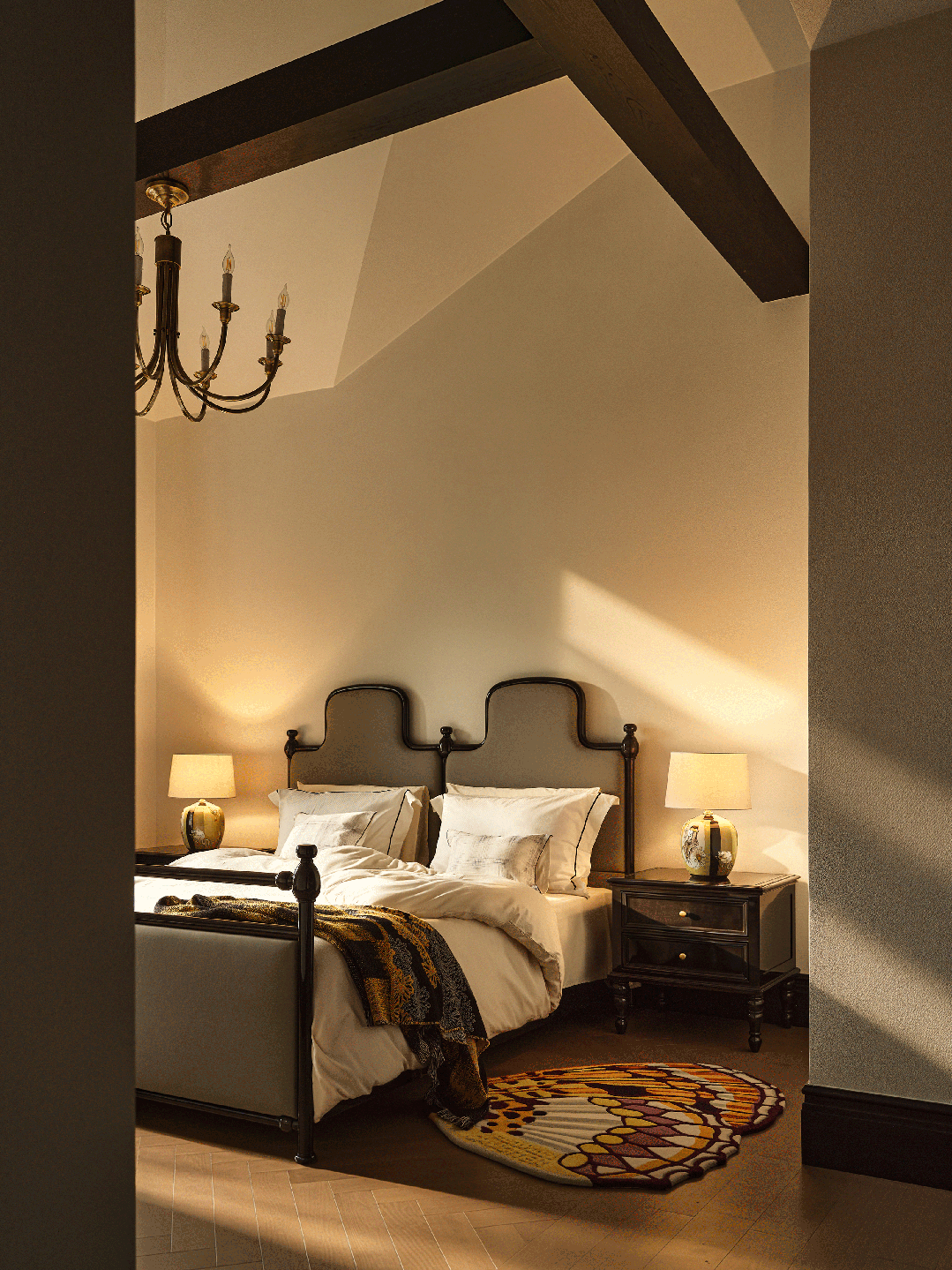 二层空间 主卧:一场关于宁静的抒情诗 微水泥质感的墙面,在夜晚灯光下泛着柔软的光。藤编椅、亚麻毯、百叶窗滤过的细碎阳光……一切都温柔得恰到好处。 我们在这个空间里埋下了许多"留白"——不是为了空缺,而是为了容纳更多的梦与月光。