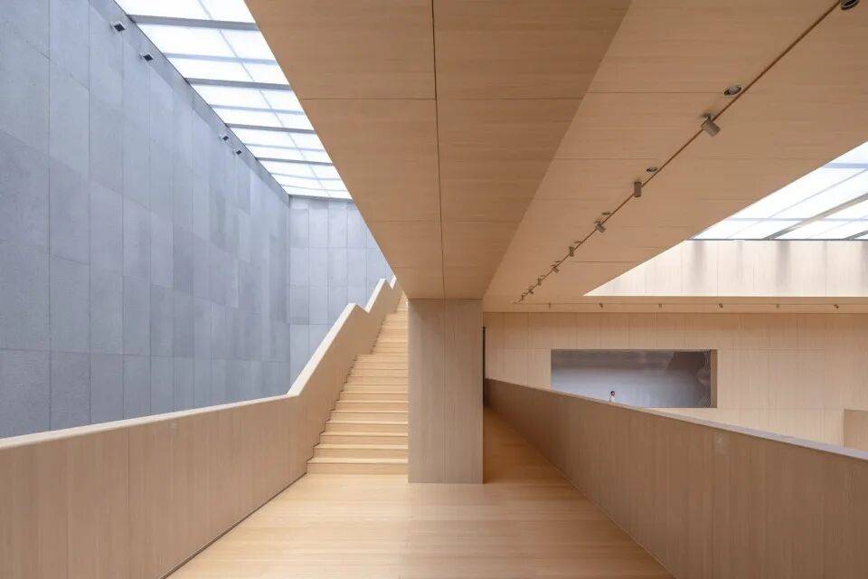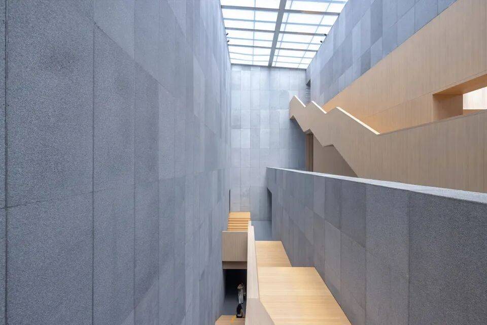 - 重构室内景观庭院为竖向交通空间:将原扁平的视知觉空间向竖向延展,采用单跑楼梯替代传统封闭交通空间,使楼梯与展陈空间交融。