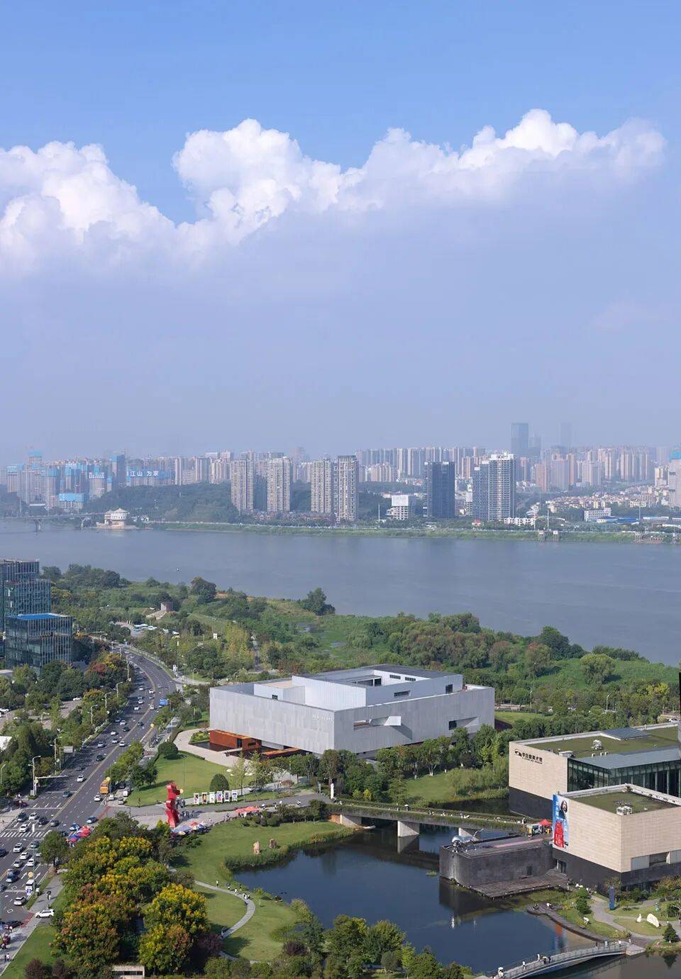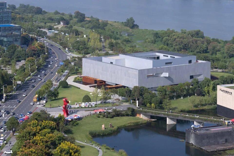 位于湘江西岸,毗邻李自健美术馆、谢子龙影像艺术馆,形成新区文化地标三角。
