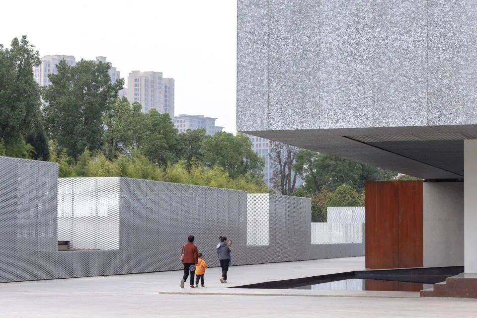 墙体内部及原建筑部分外立面采用了张拉网板。这种板材可以根据参数调整起伏和通透的效果,同时具备铝材的其他优秀性能。张拉网板另一个特殊的特性是具有方向性。从一个方向观察时,板材几乎是全透的,当板材旋转180度后,板材变为一个实体,视线几乎无法透过。结合张拉网板与泡沫铝板构成的双层表皮系统使长墙神秘和某种神性。在建筑正立面,因为墙体的双层表皮,几乎没有透光的现象,其内部无法感知,保证了立面的完整性。