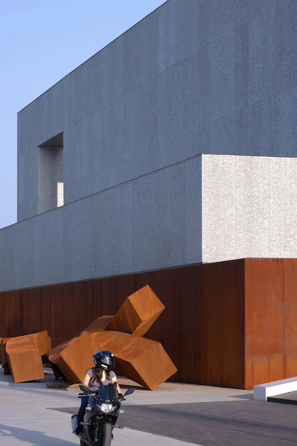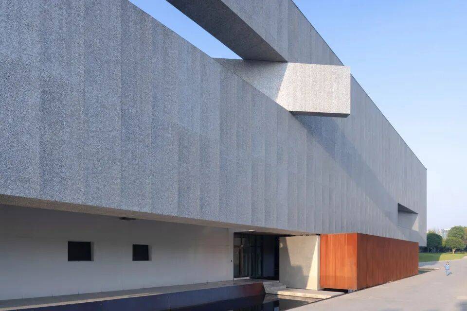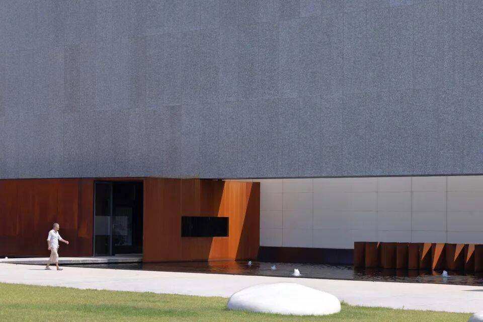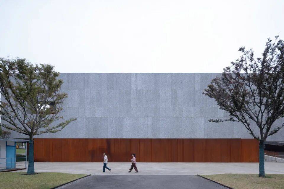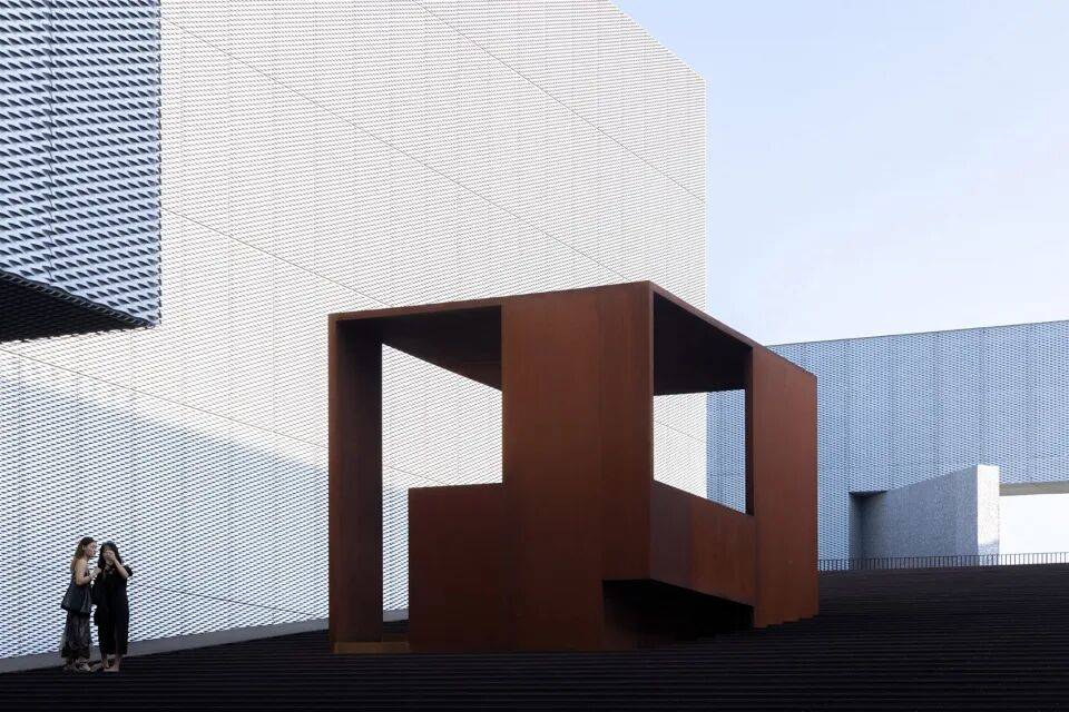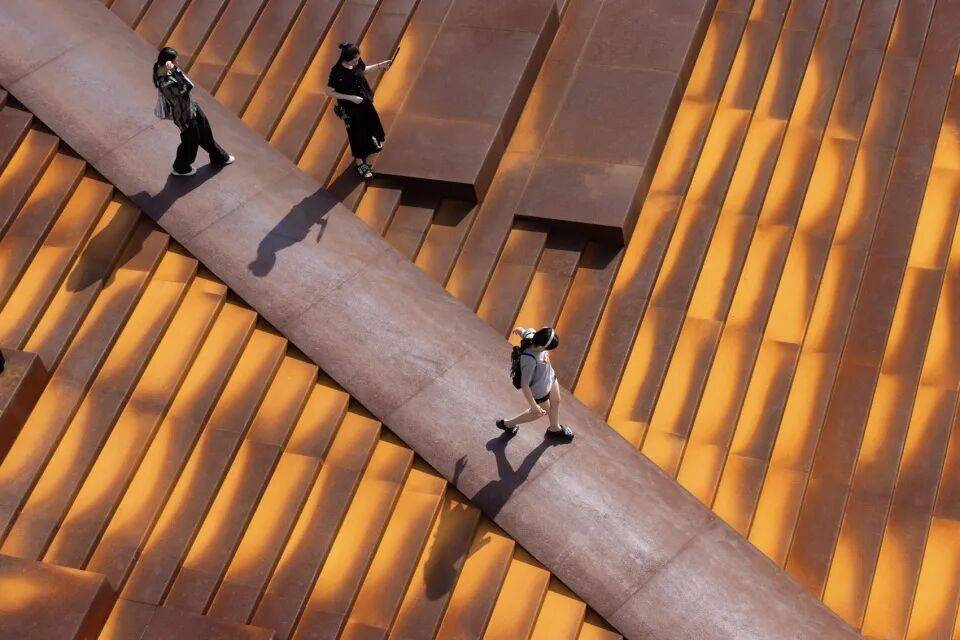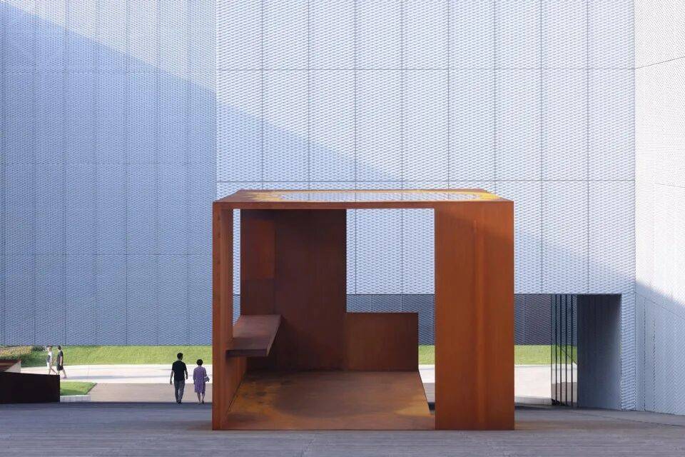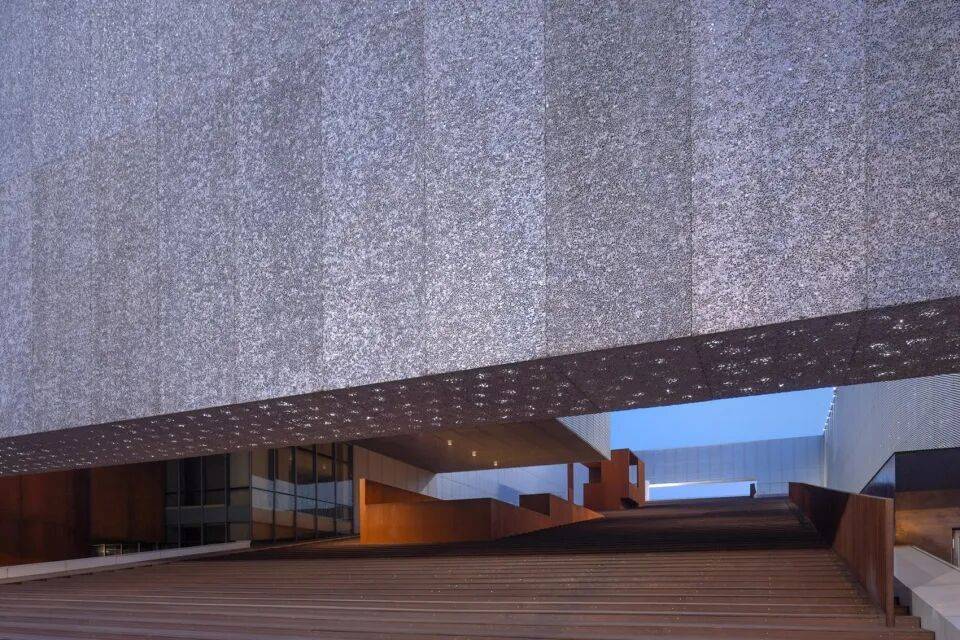 - 考顿钢板:用于底部支撑系统与入口引桥,其耐候性使其表面随时间氧化为深褐色,与上部铝板形成材质对比,强化悬浮感。