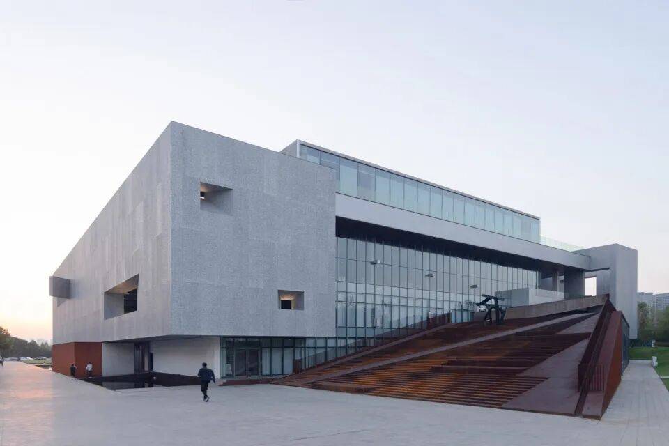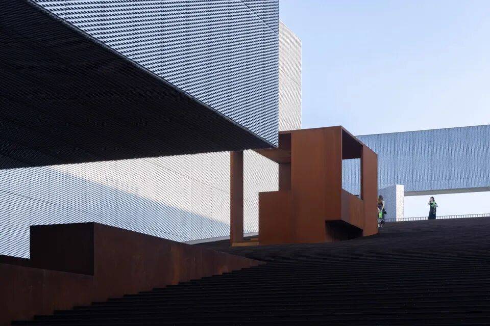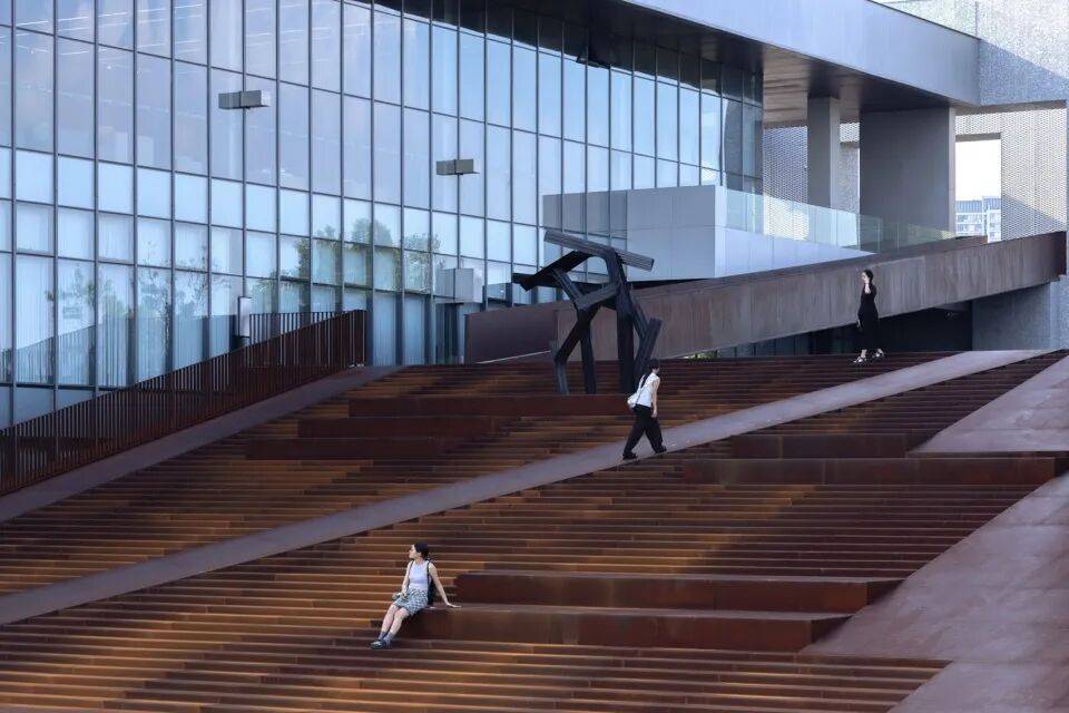- 大台阶与坡道:东面设置直角三角形大台阶,西、南向设置矩形大台阶,通过坡道连接三层平台,弱化竖向界限,强化建筑的公众属性。