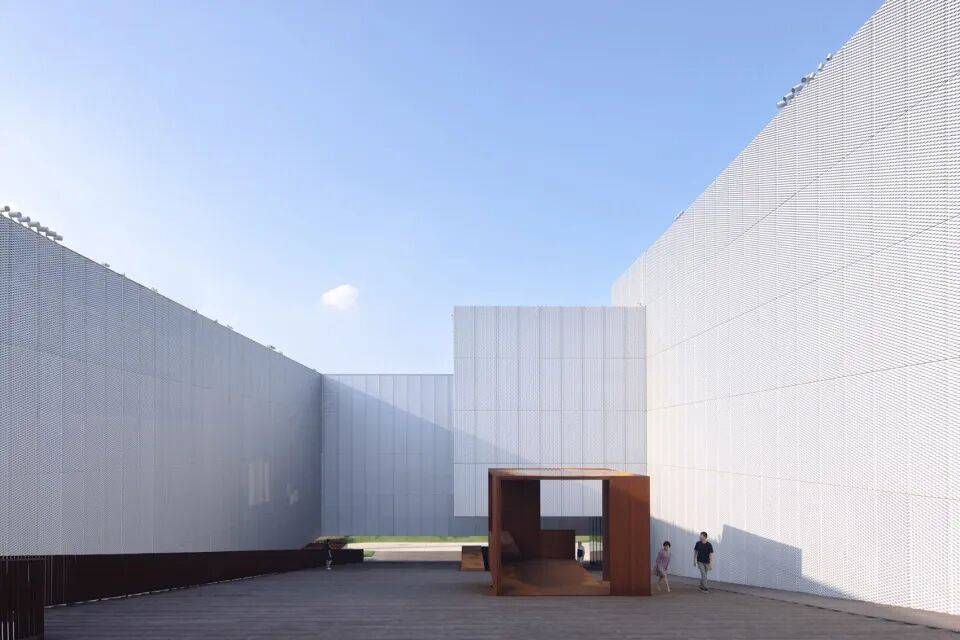 - “悬浮魔盒”的意象:超尺度悬浮的长墙与立方体入口形成对比,泡沫铝板和张拉网铝板构成的双层表皮,在不同角度和时间呈现神秘而富有神性的空间体验。