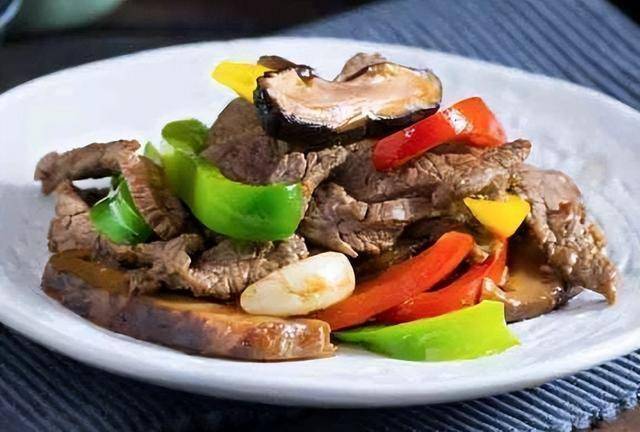 材料:牛柳、干香菇、红甜椒、绿甜椒、黄甜椒、蒜头、绍兴酒、蚝油、砂糖、香油、盐、胡椒粉、水、生抽